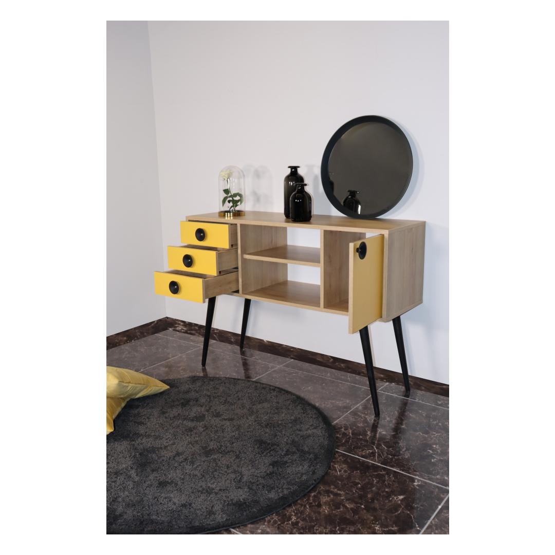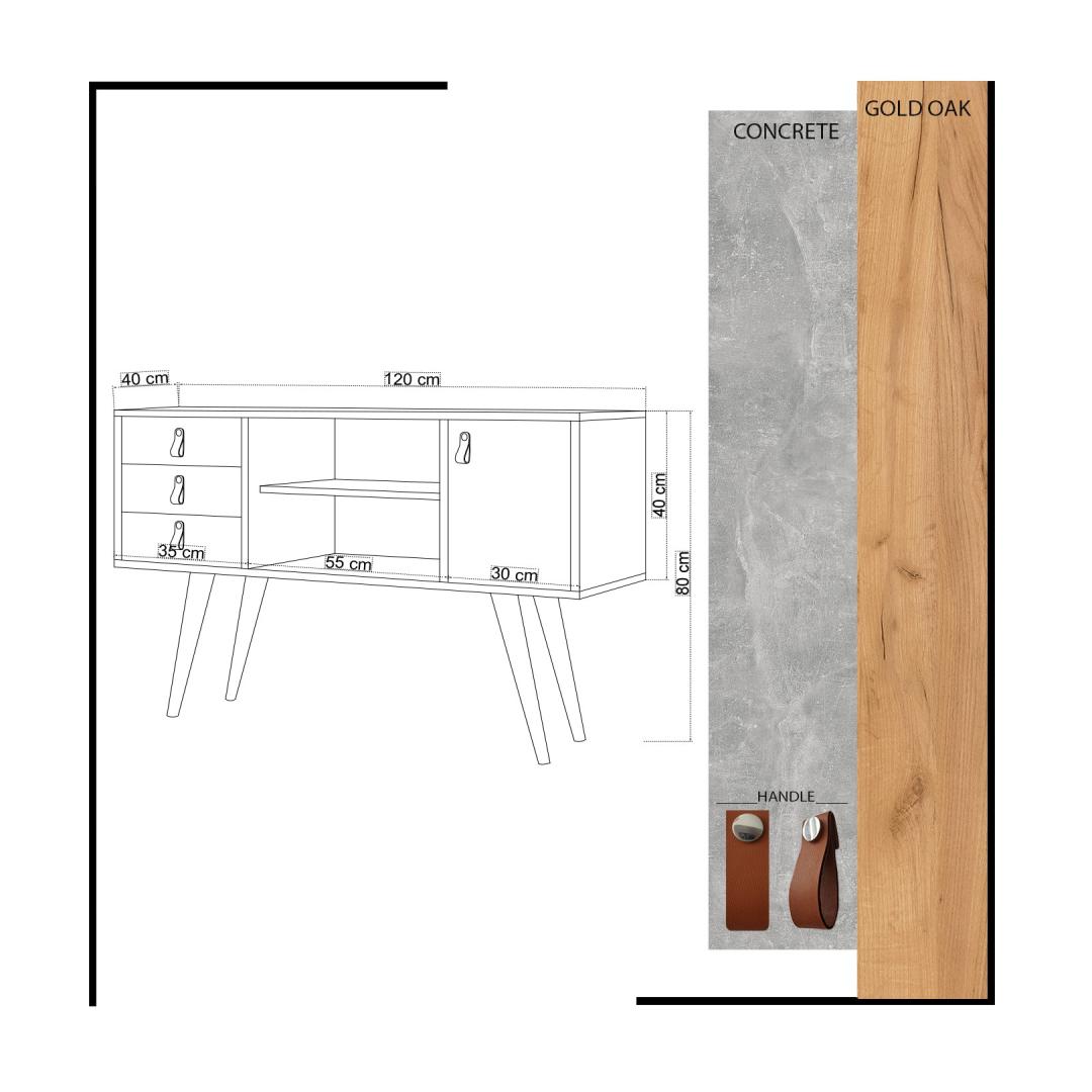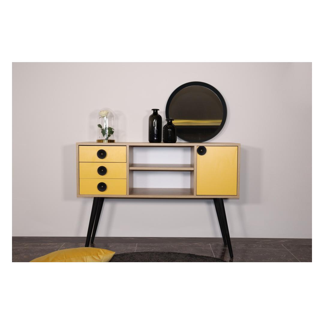 Transformeeri oma eluruum meie moodsa ja uuendusliku konsooliga!Lisage oma koju elegantsi ja stiili meie konsooliga, mis on loodud iga ruumi kaunistamiseks. See 100% melamiiniga kaetud puitlaastplaadist valmistatud konsool on valmistatud kestma ja vastu pidama igapäevasele kulumisele. Selle 18 mm paksus tagab vastupidavuse ja stabiilsuse, mis teeb sellest usaldusväärse valiku teie koju.Tugev ja stiilne disainPuidust jalgade ja metallist käepidemega konsool õhkab elegantsust ja võlu. Tamme ja kollase värvi kombinatsioon loob visuaalselt atraktiivse kontrasti, lisades teie ruumile värvi. Selle konsooli stiilne ja kaasaegne disain sobitub vaevata mis tahes sisustusstiiliga, muutes selle mitmekülgseks valikuks teie koju. Rikkalik panipaikKolme mahuka sahtli ja arvukate riiulitega pakub see konsool rohkelt hoiuruumi kõigile teie asjadele. Korraldage oma hädavajalikke asju, esitlege oma lemmikdekoori või hoiustage oma meediaseadmeid hõlpsasti. Sahtli laius 35 cm ja keskmise riiuli laius 55 cm pakuvad mitmekülgsust eri suurusega esemete hoiustamiseks. Monitoorne ja praktilineSee konsool ei ole mitte ainult stiilne, vaid ka praktiline. Selle 40 cm pikkune jala kõrgus võimaldab hõlpsasti selle alt puhastada, samas kui võimalus kinnitada see seinale tagab stabiilsuse ja ohutuse. Olenemata sellest, kas paigutate selle elutuppa, koridori või magamistuppa, see konsool tõstab koheselt teie ruumi välimust ja tunnetust. Tehnilised üksikasjad:Toote tüüp: Toode on väga lihtne ja lihtne: KonsoolMaterjal: Materjal: Materjal: Materjal: Materjal: Materjal: Materjal: Materjal: Materjal: Materjal: materjal: 100% melamiiniga kaetud puitlaastplaatPaksus: 18 mmPuidust jalad ja metallist käepideLaius: 120 cm, kõrgus: 80 cm, sügavus: 40 cmSahtli laius: 35 cm, keskmise riiuli laius: 55 cm3 sahtlit ja mitu riiulitJalgade kõrgus: 40 cmSaab kinnitada seinaleVärv: Tamm ja kollane Värv: Oak Yellow