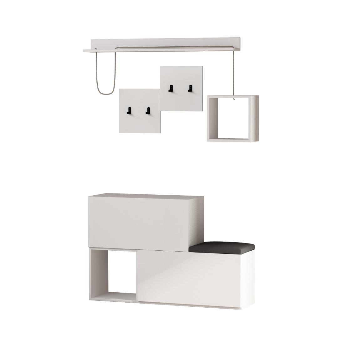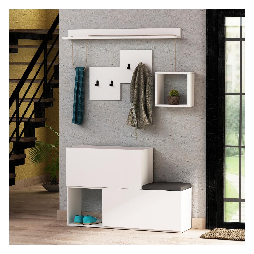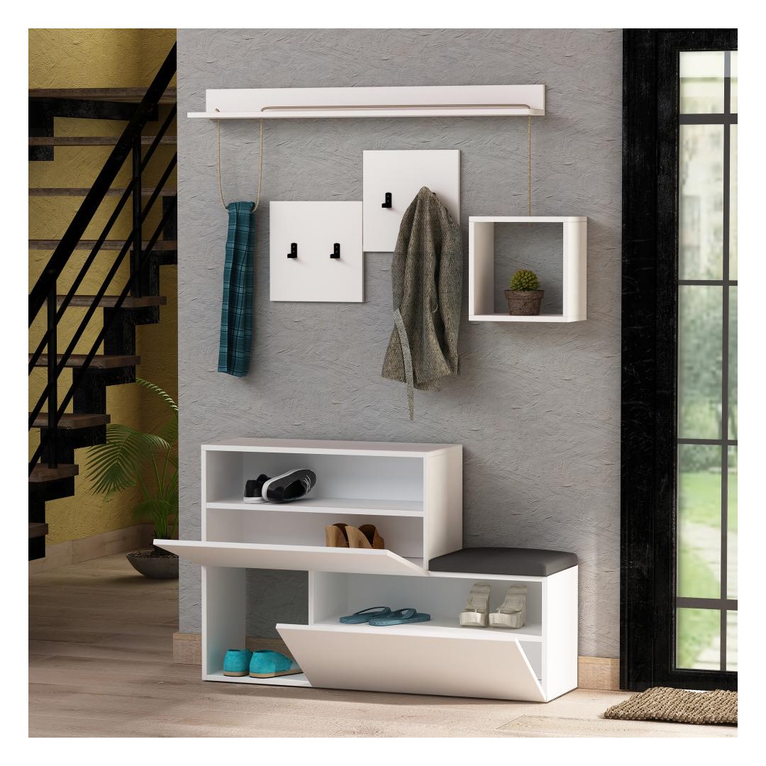Kingakapi, halli seista, ruudukujulise seina riiuli ja riputatava riidepuu kõik ühes, see halli seista sisaldab kõike, mida vajad, et hoida oma sisenemisala korras ja kutsuvana. Rohked riiulid pakuvad piisavalt hoiuruumi kingadele, kottidele ja muudele olulistele asjadele, samas kui riputatav riidepuu hoiab jakid ja sallid käeulatuses.