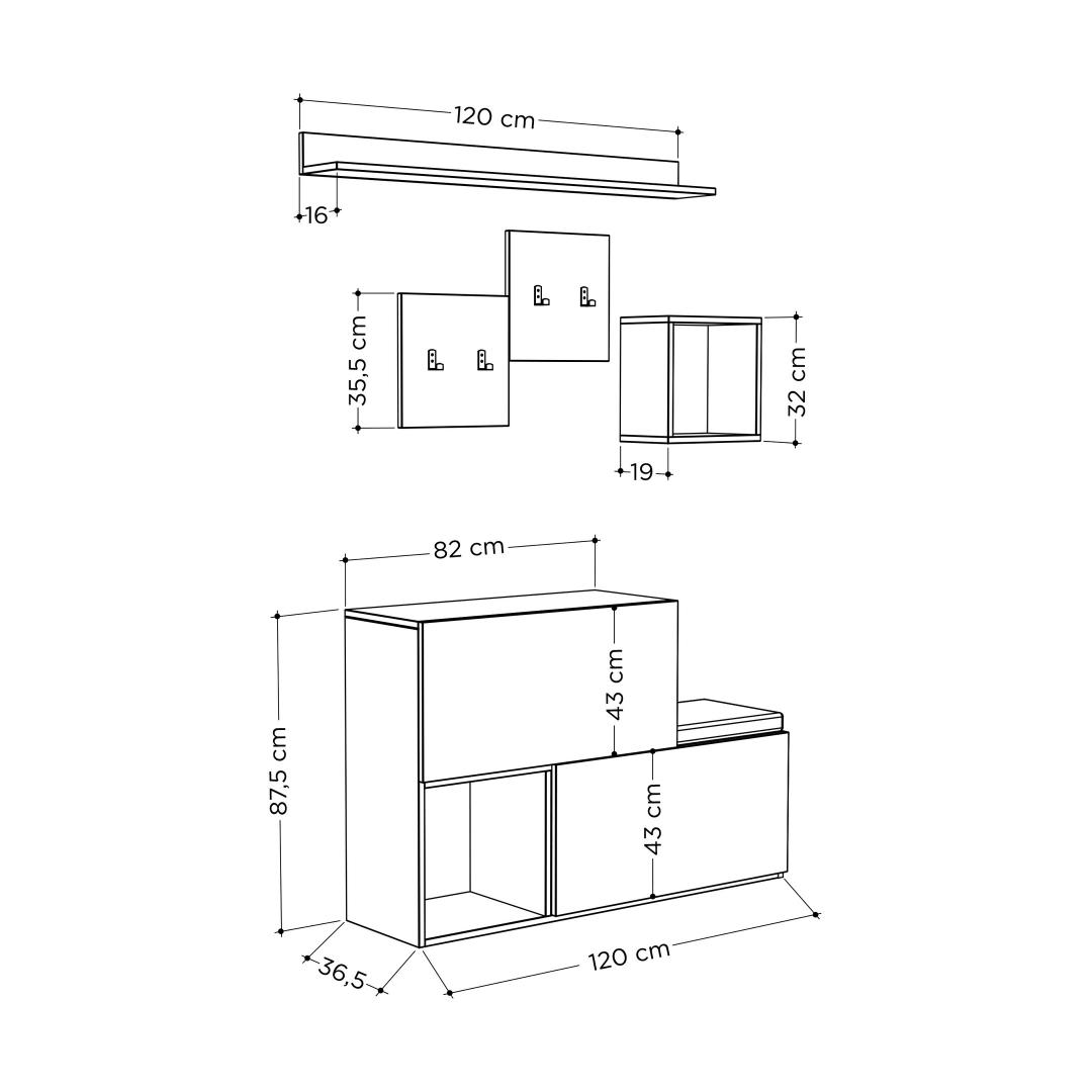 - Hall Stand'i suurus: Laius: 120 cm, Kõrgus: 76 cm, Sügavus: 17 cm