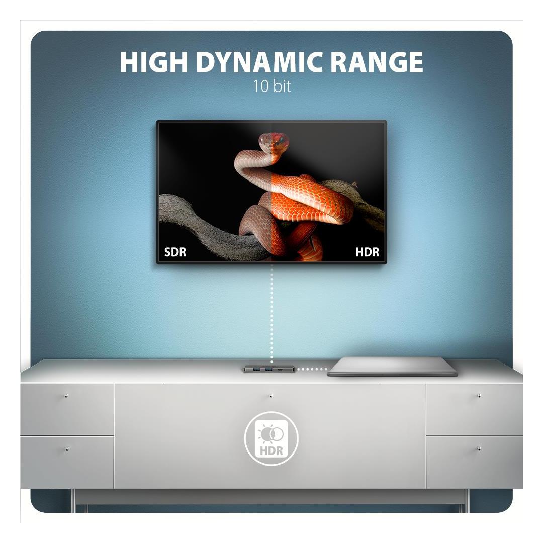 HDMI output provides high quality image up to 8K/30Hz and 4K/120Hz Ultra HD resolution supports multi-channel audio transmission. High frequencies at popular gaming resolutions of 2K/240Hz or FullHD/240Hz or FullHD/240Hz and 144HZ are also supported. Thanks to HDR (high dynamic range) support, you can enjoy a significantly expanded range of colors and contrasts without restrictions. DisplayPort Alternate Mode (DP Alt Mode) enabled USB-C port or Thunderbolt 3/4 port is necessary for the proper function of video output.