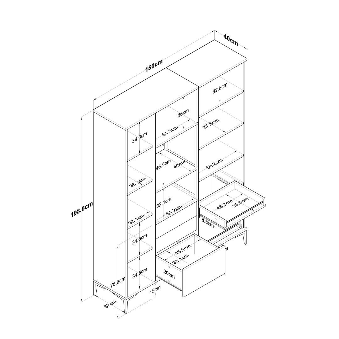 Paksus 18 mm, laius 150 cm, kõrgus 198. 6 cm ja sügavus 40 cm, pakub see kapp rohkesti hoiuruumi, ilma et see oleks stiili osas kompromissiks. Selle mitmeotstarbeline olemus võimaldab hoida erinevaid esemeid, alates raamatutest ja dokumentidest kuni riiete ja aksessuaarideni. Reguleeritavad riiulid pakuvad paindlikkust, mis võimaldab teil kohandada kapi vastavalt teie vajadustele.