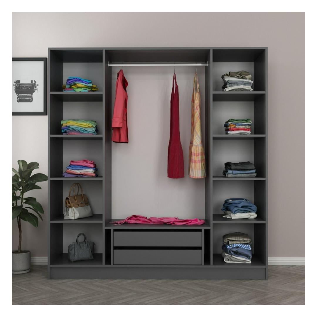 Ütle hüvasti kitsastele riidekappidele ja tere rohke hoiuruumile! meie garderoobil on palju riiuleid, mis pakuvad sulle piisavalt ruumi oma riiete, aksessuaaride ja muu korrastamiseks. 34 cm riiulite kõrgus tagab, et saate hõlpsasti ja probleemideta hoiustada ka kõige pikemaid esemeid.