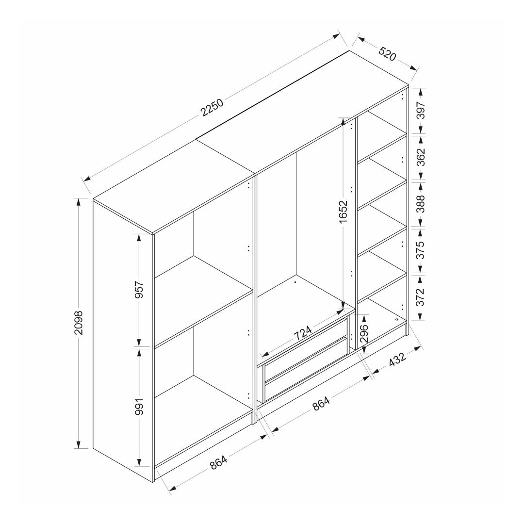 Width: 225 cm Height: 210 cm Depth: 52 cm