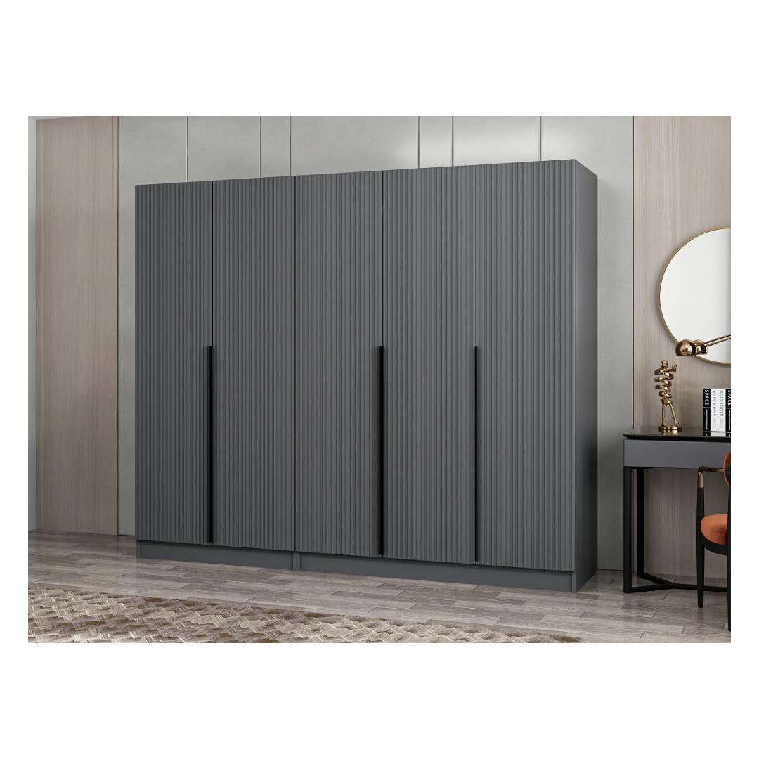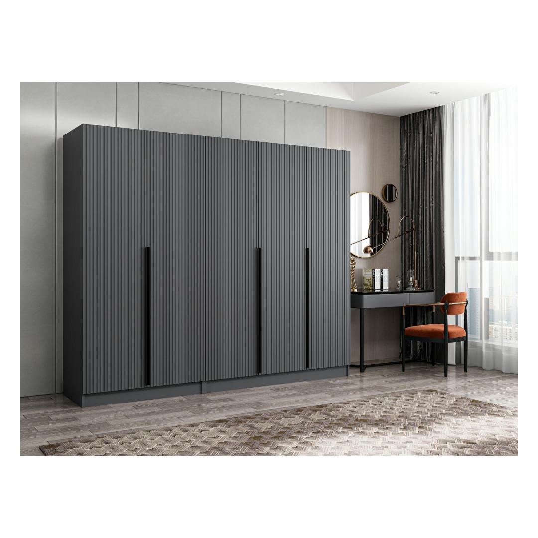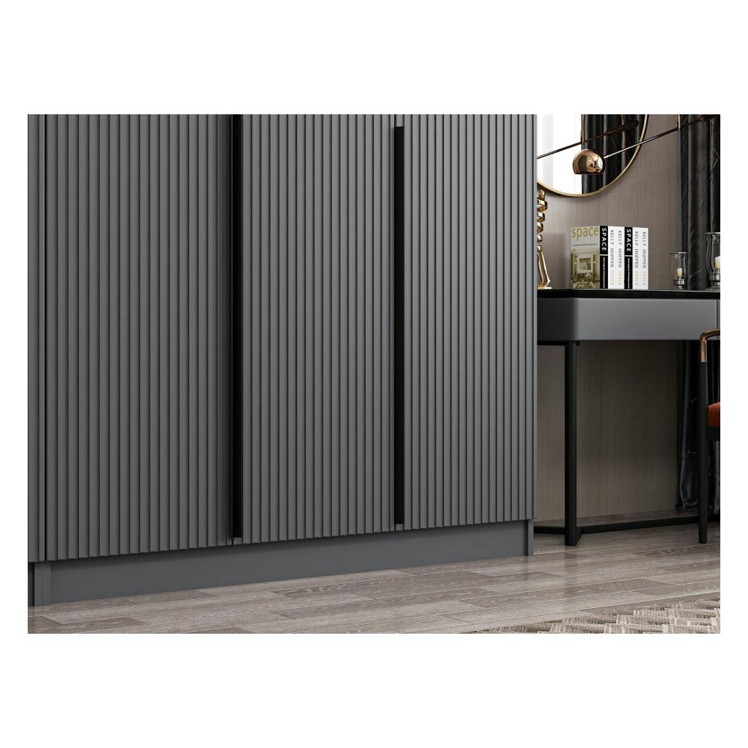 Garderoobil on elegantne ja moodne disain, mida täiendab selle uimastav antratsiitne värv. See rafineeritud toon lisab teie magamistuppa luksust, luues rahulikku ja stiilset atmosfääri, kuhu teile meeldib koju tulla.