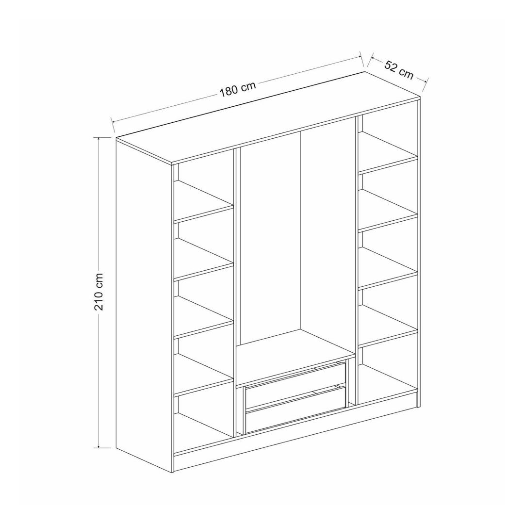 Suurepäraste mõõtmetega (180 cm laius, 210 cm kõrgus ja 52 cm sügavus) pakub see riidekapp rohkelt ruumi oma riiete, aksessuaaride ja isiklike asjade korrastamiseks. Arvukad riiulid pakuvad mugavaid lahtreid, et kõik oleks korras, muutes teie igapäevaelu lihtsaks.