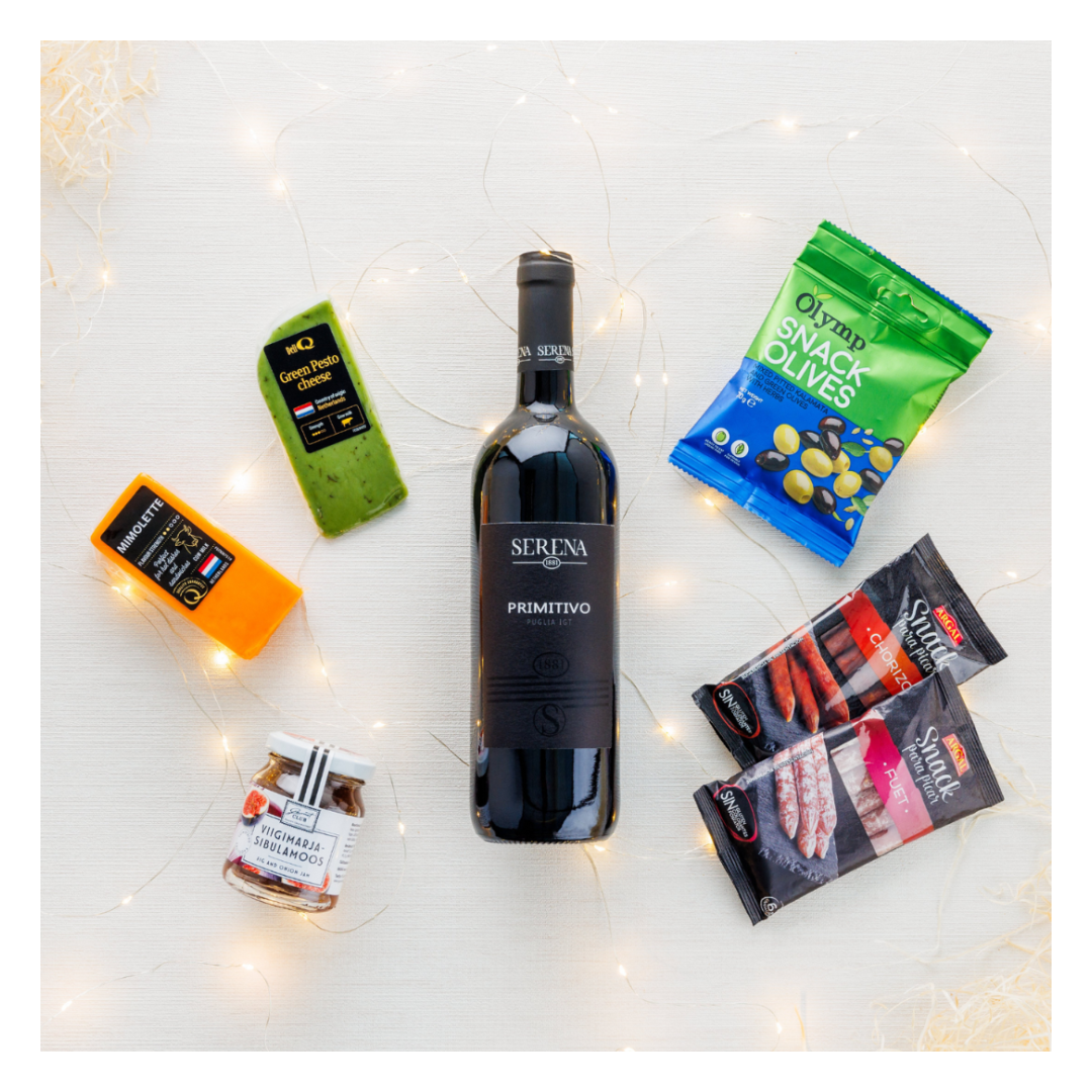 Üllatage oma häid kolleege ja koostööpartnereid kinkekorviga! TELLIMINE: üle 50tk tellimisel on pakkimise aeg 2-5 päeva. Tellimiseks lisa ostukorvi soovitud kogus ja kirjuta tellimuse kinnitamisel kommentaari soovitud kättesaamise aeg. Tellimuse täpsustamiseks võtame Teiega ühendust! PAKIS PEIDUS: DITTMANN Rohelised oliivid sinihallitusjuustukreemiga 200g; LEVERNO Viigimarja-sinepikaste 90ml; GRAND ´OR Gardeli Hollandi juust ürtidega 200g; COSTA BRAVA Tapas Mix Serrano+Chorizo+Salchichon 120g (viil); JEDEN TAG Röstitud maapähklid 150g (vürtsikad); JEDEN TAG Soolapulgad 250g; RAMON ROQUETA Garnacha Tinta 14% 75 cl (punane, kuiv).