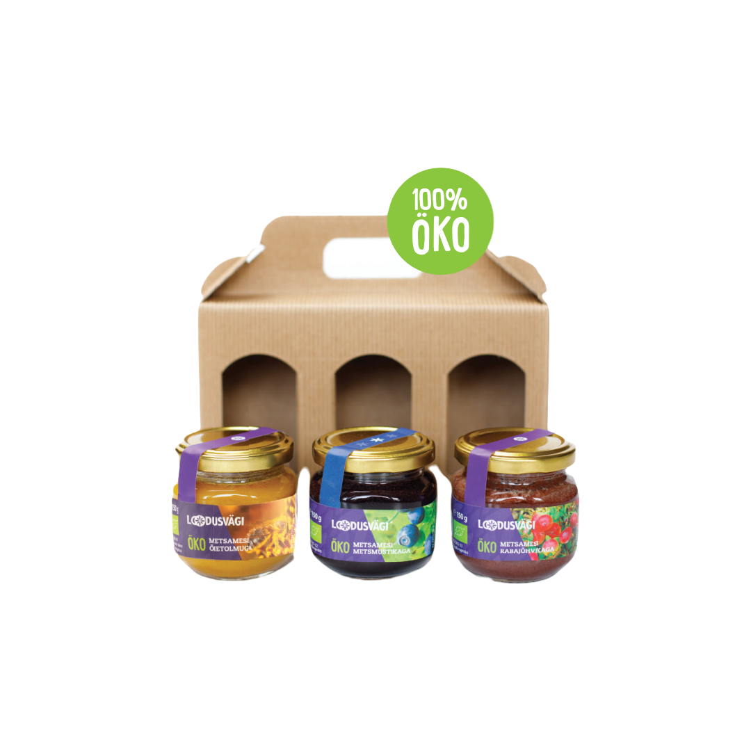 • Komplektis sisalduvad tooted: • Loodusvägi ÖKO metsamesi, õietolmuga 150g • Loodusvägi ÖKO metsamesi, rabajõhvika 150g • Loodusvägi ÖKO metsamesi, mustika 150 g • Kinkekarp meele • Valik erinevat sorti ÖKO metsamett kinkekarbis. Loodusvägi metsamesi on korjatud Eesti tunnustatud mahekorjealadelt. Maitsemesi on segu siidisest meest ning naturaalselt marjamaitsest.