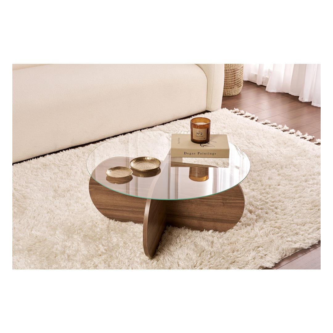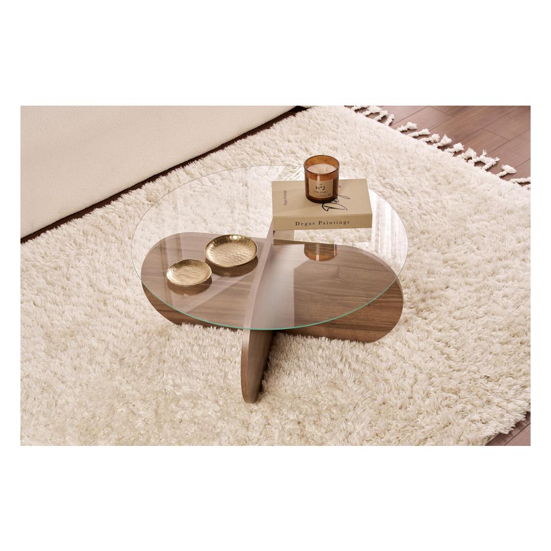 Tõsta oma eluruumi meie kauni kohvilaudadega, mis on valmistatud 100% karastatud klaasist, et saavutada stiilne ja kaasaegne välimus. Läbipaistev klaasist pind võimaldab sul esitleda oma lemmik dekoratiivesemeid, samas kui pähklipuidust melamiinkattega puitlaastplaadi raam lisab ruumile soojust.