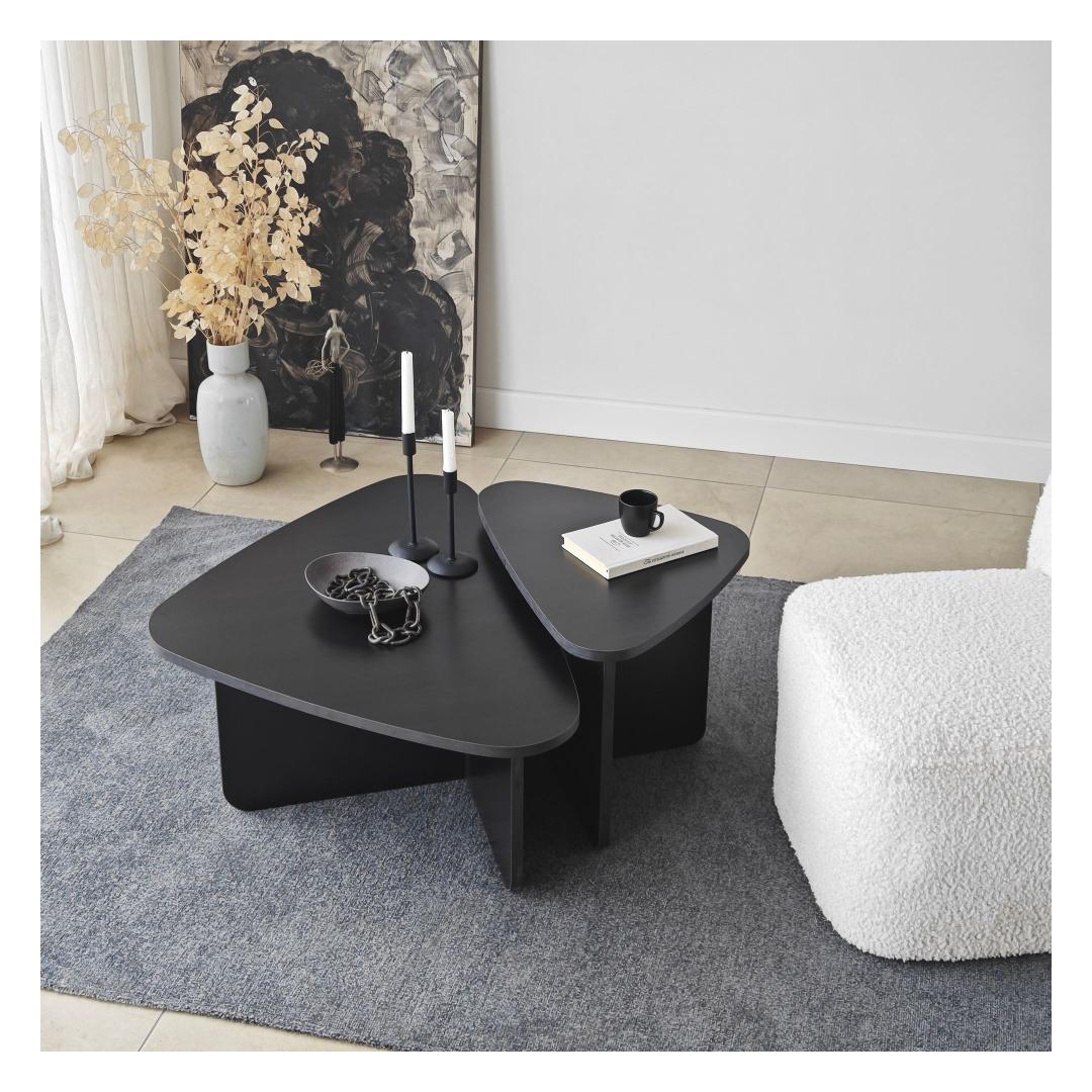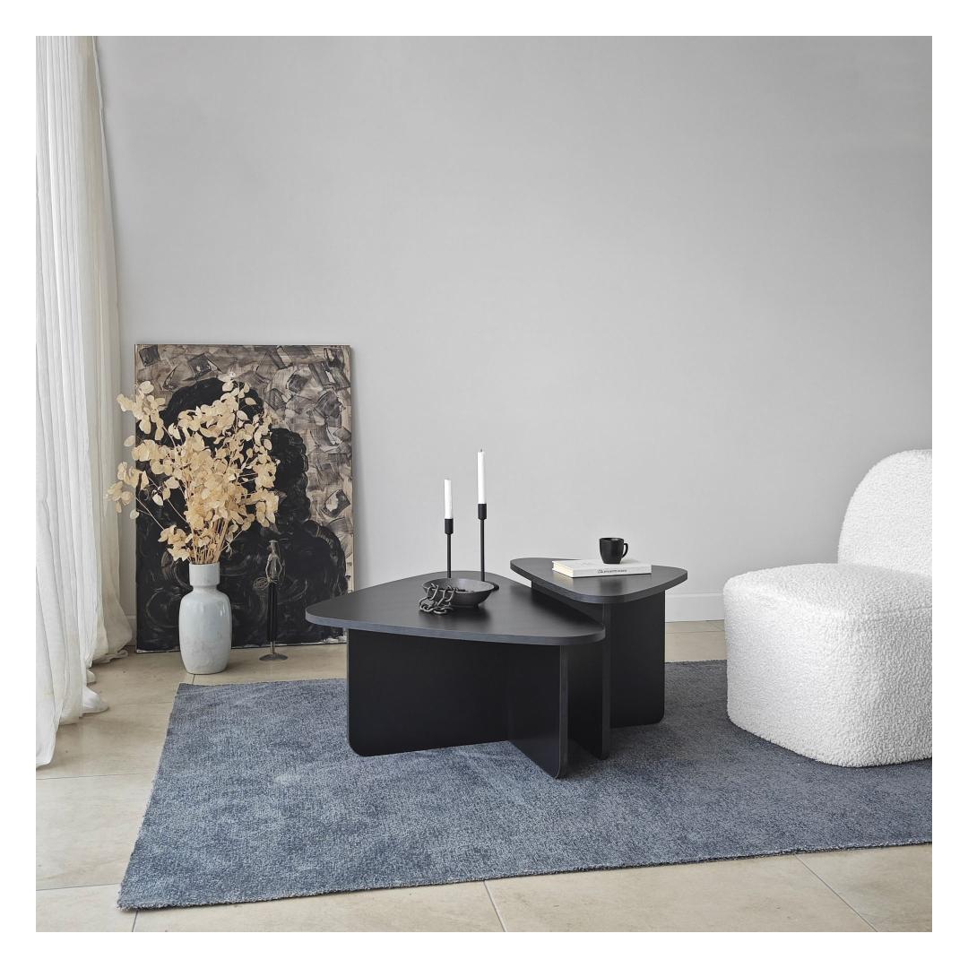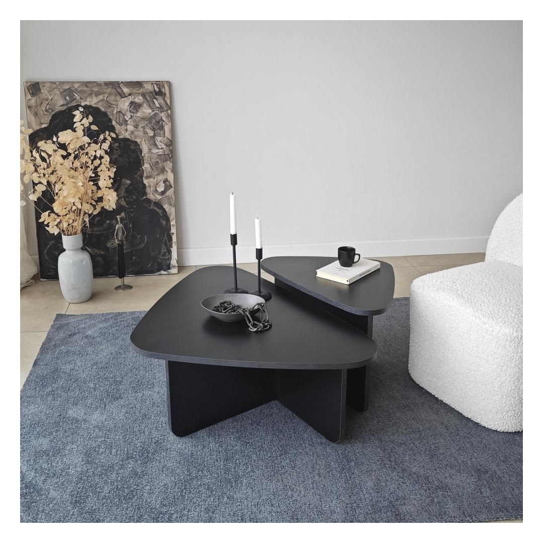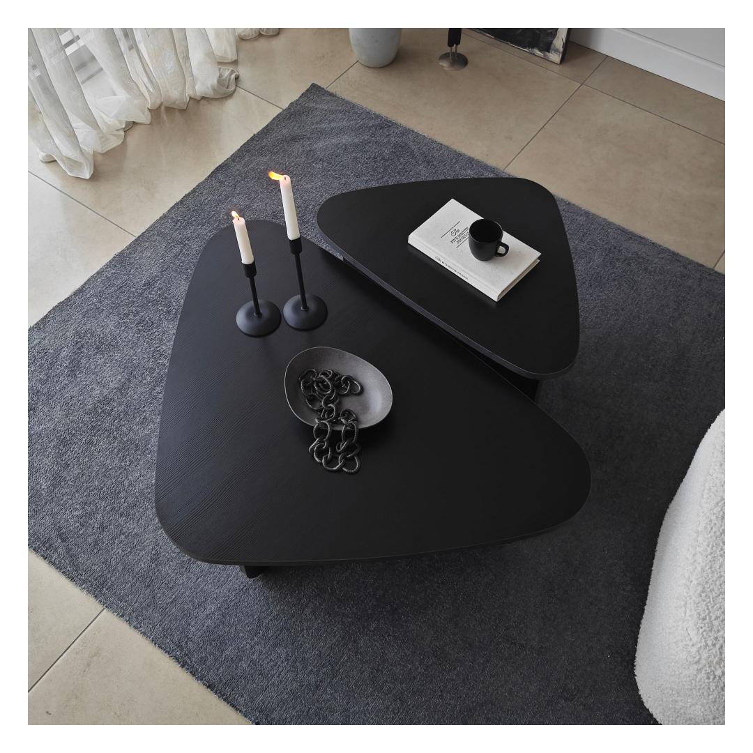 Kohvilaudade komplekti must värv lisab elegantsi igasse ruumi, samas kui 100% melamiiniga kaetud puitlaastplaadi raam tagab vastupidavuse ja pikaealisuse. PVC-kantliistud lisavad komplektile lihvitud viimistluse, muutes selle teie kodu sisustusele ajatuks täienduseks.