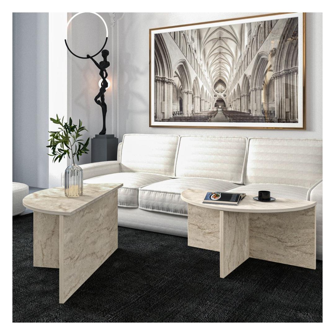 Esitleme meie kaunist Travertine kohvilaudade komplekti, mis on loodud teie eluruumi tõstmiseks oma elegantse ja modernse disainiga. See komplekt sisaldab kahte lauda, mis on valmistatud 100% melamiinkattega puitlaastplaadist, tagades vastupidavuse ja pikaealisuse aastateks.Tõstke oma eluruumNeed laudade travertiini värv lisab igasse ruumi natuke rafineeritust, muutes selle ideaalseks lisandiks teie kodu sisustusse. Sujuv ja minimalistlik disain täiendab igasuguseid stiile, olgu need siis kaasaegsed või traditsioonilised.Funktsionaalne ja stiilneNeed lauad on mitte ainult esteetiliselt meeldivad, vaid ka väga funktsionaalsed. Kaks erinevat suurust võimaldavad mitmekesist kasutamist, olgu teil vaja suuremat pinda külaliste vastuvõtmiseks või väiksemat lauda igapäevaseks kasutamiseks. 18 mm paksune puitlaastplaat lisab laudadele tugevust, muutes need ideaalseks kohvi, raamatute või dekoratiivsete esemete hoidmiseks.Tehnilised andmed:Materjal: 100% melamiinkattega puitlaastplaatPaksus: 18 mmEsimene laud: Laius: 70 cm, Kõrgus: 51,8 cm, Sügavus: 38 cmTeine laud: Laius: 70 cm, Kõrgus: 47,5 cm, Sügavus: 35 cmVärv: TravertineUuendage oma eluruumi meie Travertine kohvilaudade komplektiga ja kogege stiili ja funktsionaalsuse ideaalset segu. Lisage see komplekt oma ostukorvi juba täna ja muutke oma kodu stiilseks oaasiks. Värv: Travertine