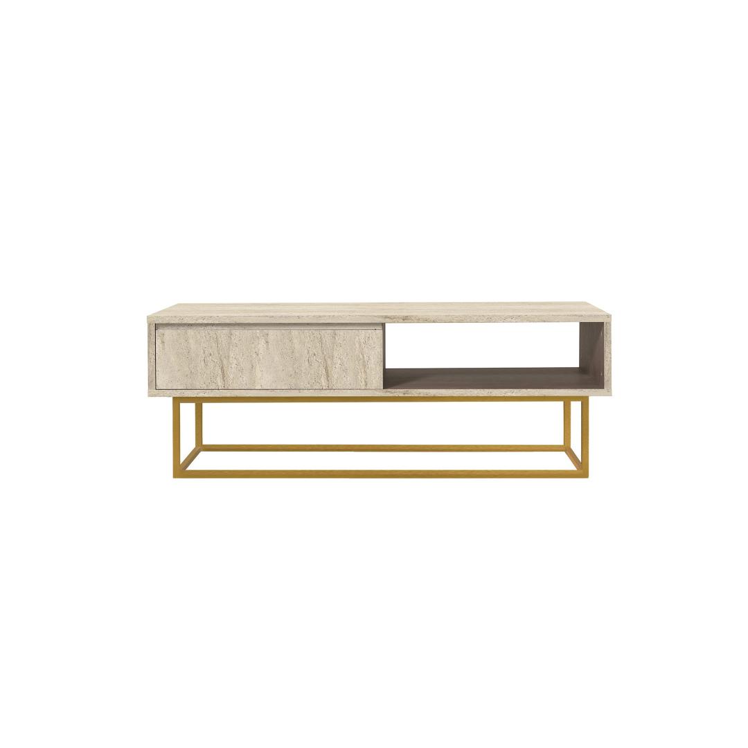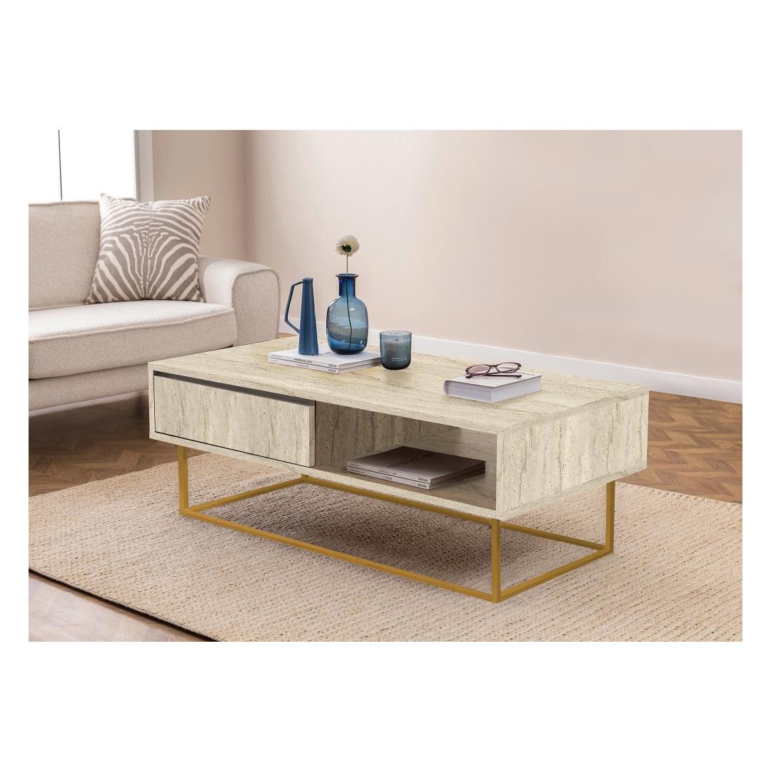 Muuda oma elutuba luksuslikuks ja stiilseks ruumiks meie marmorist kohvilaudadega. Valmistatud 100% melamiinkattega puitlaastplaadist, kiirgab see kohvilaud elegantsi ja rafineeritust. Metallraam lisab modernset puudutust, samas kui travertiini värv toob teie sisustusse soojust.Tõsta oma eluruumi tasetLisa oma elutuppa klassi selle 2-tasandilise mitmeotstarbelise kohvilaudaga. Täiendav hoiuruum võimaldab hoida elutuba korras, samas kui 17 cm kõrgune riiul pakub piisavalt ruumi teie lemmikraamatutele, ajakirjadele või dekoratiivsetele esemetel.Stabiilne ja stiilne disain18 mm paksune melamiinkattega puitlaastplaat tagab vastupidavuse ja pikaealisuse, samas kui metallraam pakub stabiilsust ja tuge. Selle kohvilauda sujuv ja modernne disain tõstab koheselt teie elutoa välimust.Tehnilised andmed:Materjal: 100% melamiinkattega puitlaastplaatPaksus: 18 mmMetallraam täiendava toe jaoksSuurus: Laius: 120 cm, Kõrgus: 43 cm, Sügavus: 60 cmRiiuli kõrgus: 17 cmVärv: Travertiini värv(ide) Värv: Travertine