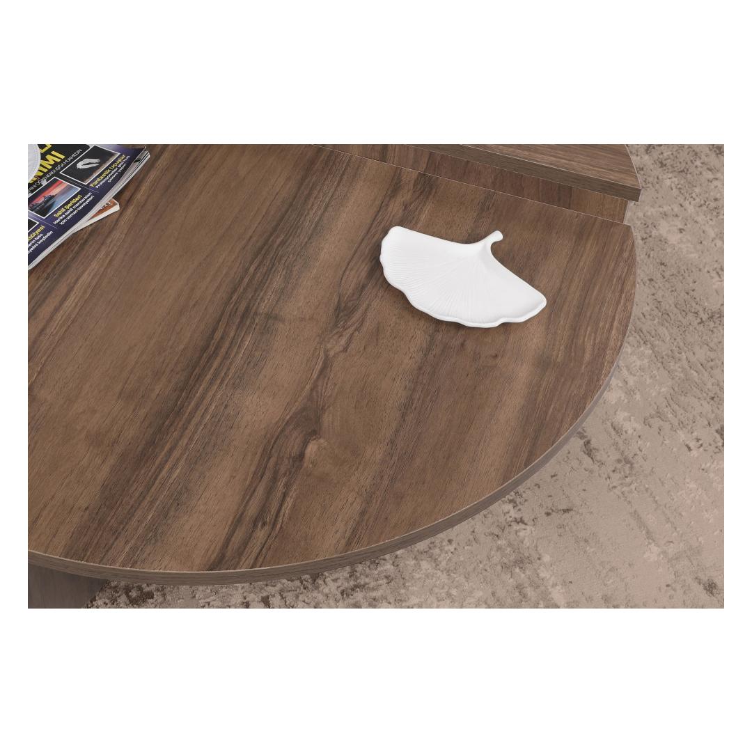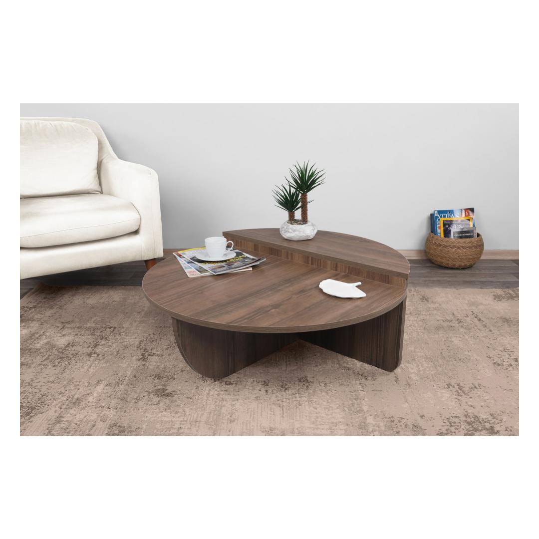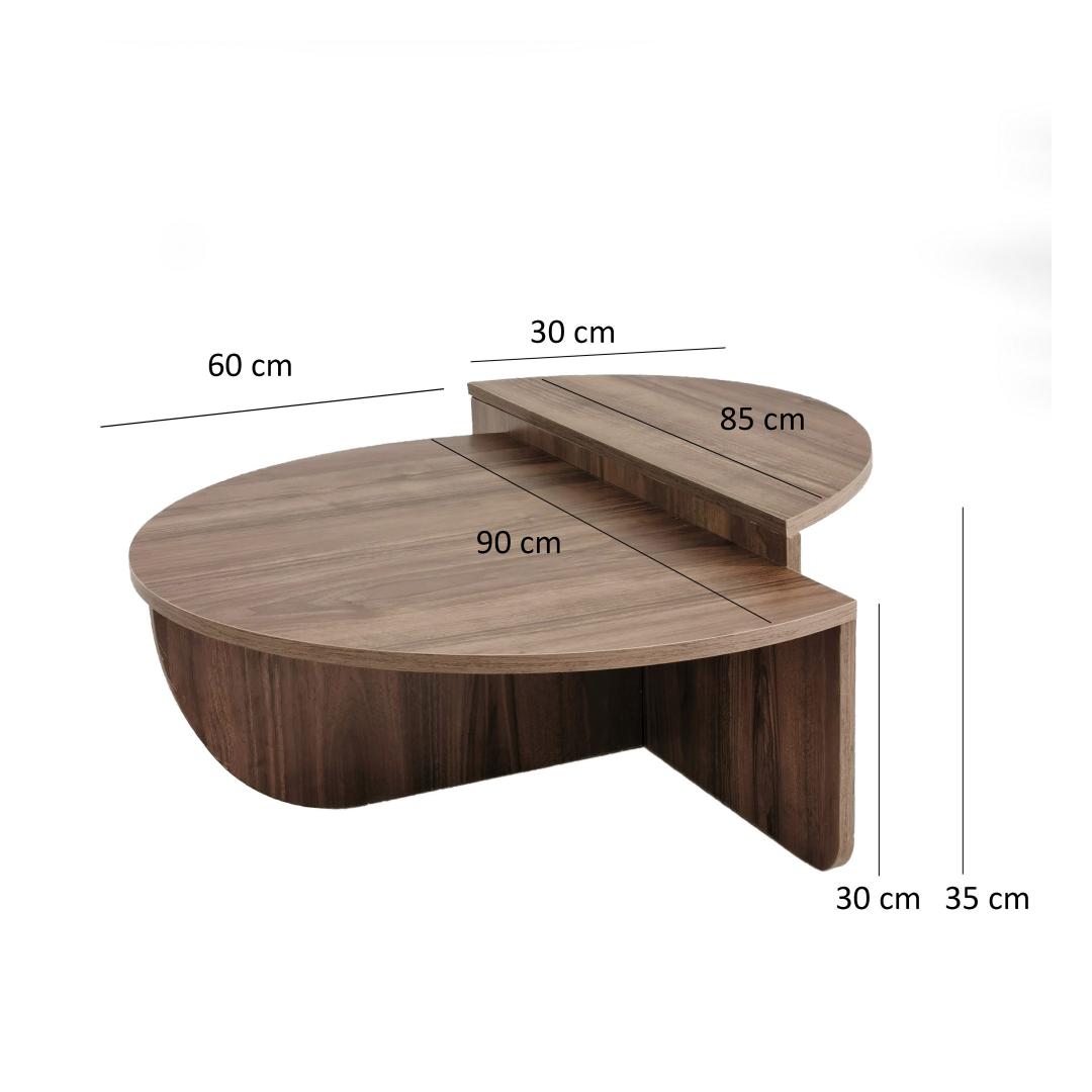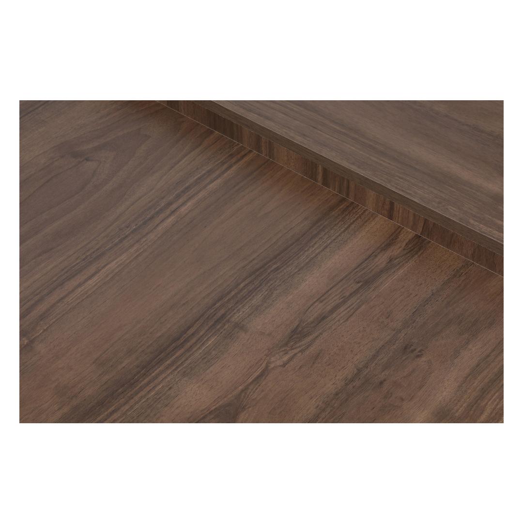 Meie kohvilaud on valmistatud 100% melamiiniga kaetud puitlaastplaadist, mis on ehitatud kestma. 18 mm paksus tagab vastupidavuse ja stabiilsuse, muutes selle usaldusväärseks mööbliesemeks aastateks. Pähklipuu värv lisab teie eluruumile elegantsi ja elegantsi.