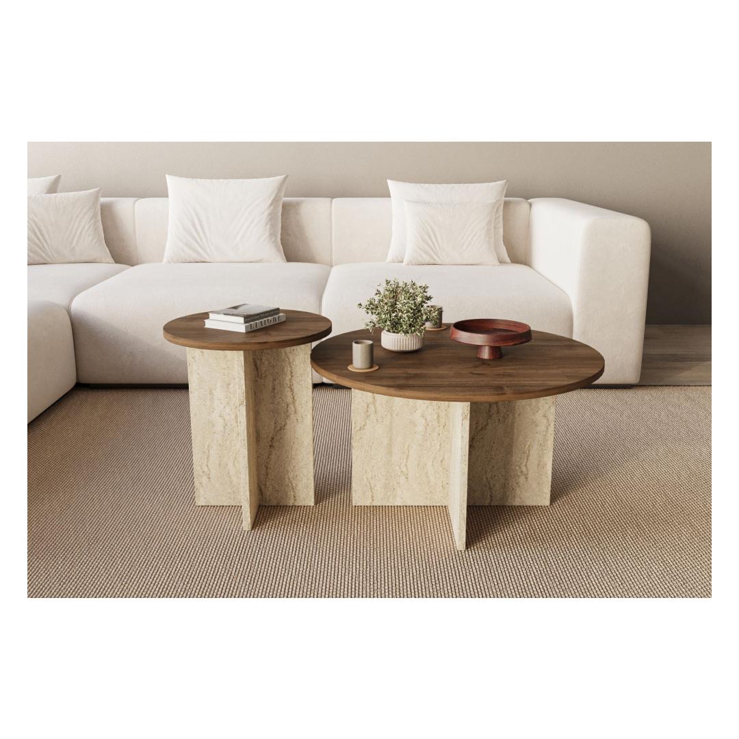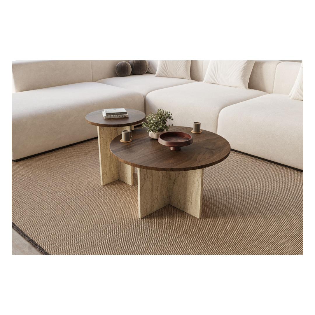 Muuda oma elutuba stiilseks ja kutsuvaks ruumiks meie kauni kohvilaudade komplektiga. Valmistatud 100% melamiinkattega puitlaastplaadist, on see komplekt mitte ainult vastupidav, vaid ka äärmiselt elegantne. Rikkalikud pähklipuu ja travertiini värvid lisavad igasse ruumi natuke rafineeritust, muutes selle ideaalseks lisandiks teie kodu sisustusse.Tõsta oma eluruumi tasetSuur laua mõõdud on 70 cm laius, 40 cm kõrgus ja 70 cm sügavus, samas kui väikese laua mõõdud on 40 cm laius, 47 cm kõrgus ja 40 cm sügavus. See komplekt on loodud pakkuma piisavalt pinda teie kohvitasside, raamatute ja dekoratiivsete esemete jaoks, võimaldades teil luua hubase ja funktsionaalse eluruumi.Lihtne kokku pannaSee kohvilaudade komplekt tuleb lahtivõetuna, muutes selle lihtsaks transportimiseks ja paigaldamiseks igasse valitud ruumi. Selgete juhiste ja kõigi vajalike kinnitusdetailidega saate oma uue kohvilauda kiiresti üles seada ja kasutamiseks valmis.Tehnilised andmed:Materjal: 100% melamiinkattega puitlaastplaatVärvid: pähklipuu ja travertiiniMõõdud:Suur laud: laius: 70 cm, kõrgus: 40 cm, sügavus: 70 cmVäike laud: laius: 40 cm, kõrgus: 47 cm, sügavus: 40 cmÄrge laske mööda võimalust täiustada oma eluruumi selle suurepärase kohvilaudade komplektiga. Tellige oma täna ja nautige stiili ja funktsionaalsuse ideaalset segu oma kodus. Värv: Walnut Travertine