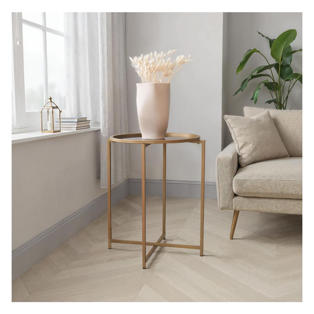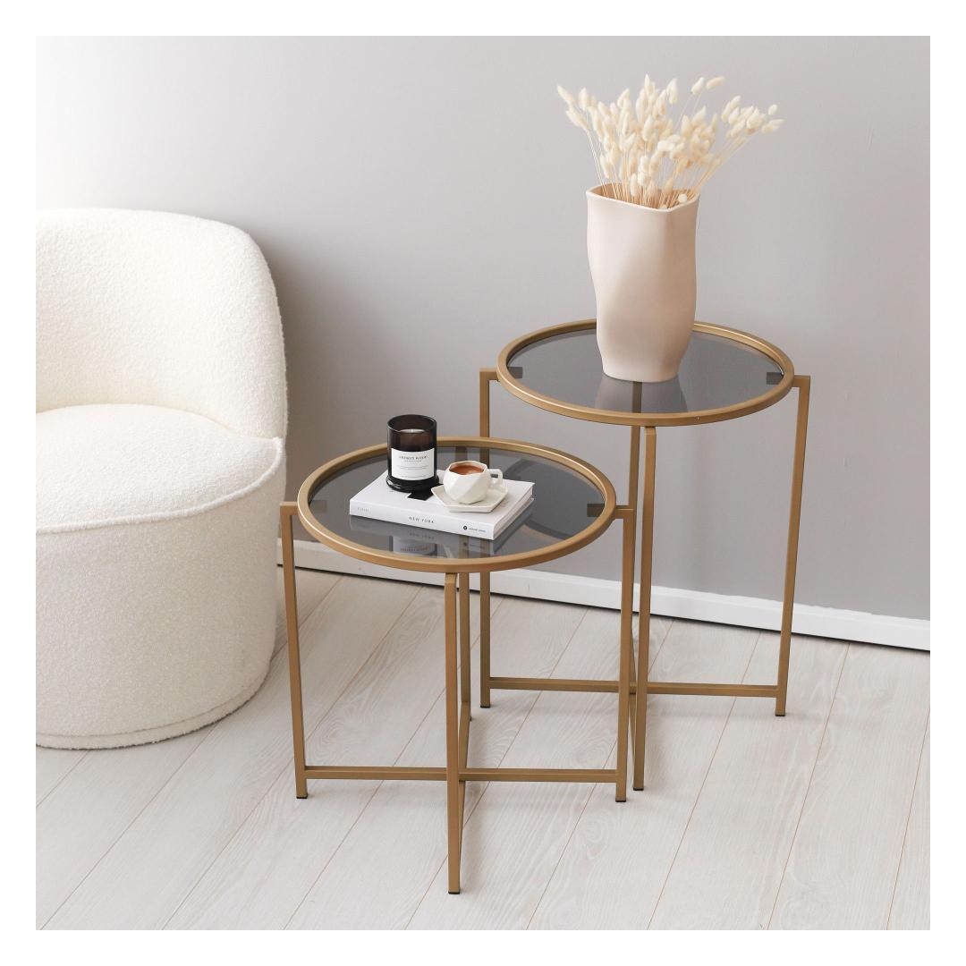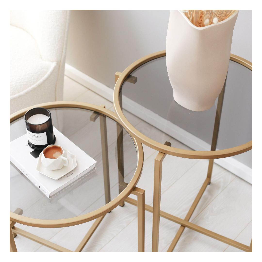 Selle kohvilaua kuld- ja suitsuvärvide kombinatsioon õhkab rafineeritust ja stiili. Kontrastsed toonid loovad lummava visuaalse atraktiivsuse, muutes selle tähelepanu keskpunktiks igas ruumis. Kompaktsete mõõtmetega (50 cm laius, 60 cm kõrgus ja 50 cm sügavus) on see mitmekülgne ese, mis sobib sujuvalt igasse ruumi.