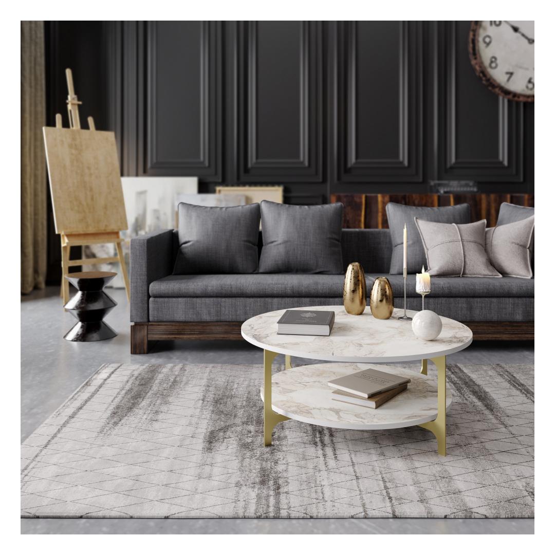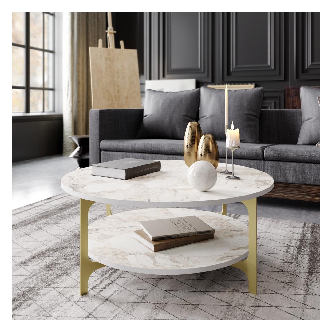 Tutvustame meie suurepärast marmorist disainitud kohvilauda, mis on tõeline meistriteos, mis muudab teie eluruumi elegantsi ja rafineerituse paradiisiks. Tõstke oma kodu ajatu ilugaSee uimastava marmordisainiga kohvilaud ühendab vaevata modernsuse ja uudsuse, luues lummava fookuspunkti, mis jätab teie külalised imestama. Keerukad kuldsed ja valged värvid sulanduvad sujuvalt, lisades igasse ruumi glamuuri.Kvaliteeti ja vastupidavust silmas pidadesMeie kohvilaud on valmistatud 100% melamiiniga kaetud puitlaastplaadist, mis tagab erakordse tugevuse ja vastupidavuse. 18 mm paksus tagab tugeva ja usaldusväärse pinna, mis sobib ideaalselt teie lemmikraamatute, ajakirjade või dekoratiivsete esemete esitlemiseks. Täiuslik tasakaal stiili ja funktsionaalsuse vahelTänu elegantsetele metalljalgadele ei väljenda see kohvilaud mitte ainult elegantsust, vaid pakub ka stabiilsust ja tuge. Avarad mõõtmed 90 cm laius, 90 cm kõrgus ja 36. 8cm sügavus pakuvad piisavalt ruumi teie asjadele, samas kui 20cm kõrgune riiul võimaldab mugavat hoiustamist. Muutke oma eluruum juba tänaVärskendage oma kodu meie marmorse disainiga kohvilauda ja kogege luksuse kehastust. Selle kütkestav disain ja laitmatu käsitöö loovad sooja ja kutsuva atmosfääri, muutes selle ideaalseks täienduseks igasse elutuppa või salongi. Tehnilised üksikasjad:Toote tüüp: Toode on mõeldud kasutamiseks, kui see ei ole vajalik, kuid see on võimalik: KohvilaudMaterjal: Materjal: Materjal: Materjal: Materjal: Materjal: Materjal: Materjal: materjal: 100% melamiiniga kaetud puitlaastplaatPaksus: 18mmJalad: MetallistMõõdud: Jalgade mõõtmed: Materjal: Materjal: Materjal: Jalg, mis on valmistatud puidust, kuid ei ole kaetud: Laius: 90cmKõrgus: 90cmSügavus: 36,8cmRiiuli kõrgus: 20cmVärv: kuldne ja valgeKontseptsioon: Kaasaegne - uudsus, Glam Värv: Gold White