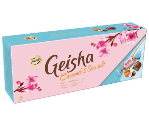 Geisha piimašokolaad, mis on ümbritsetud sarapuupähkli-nuugati täidisega soolakaramelli krõmpsuga. Maitsvate Geisha pralineede piimašokolaadikatte all ootab pehme, kuid krõbe täidis. Kõik Fazeri maitsvad šokolaadid on valmistatud 100% vastutustundlikult toodetud kakaost. Andke oma lähedastele natuke aega koos ja tooge välja mõned maitsvad Geisha šokolaadid. Kaunis šokolaadikarp on ka meeldejääv kingitus.