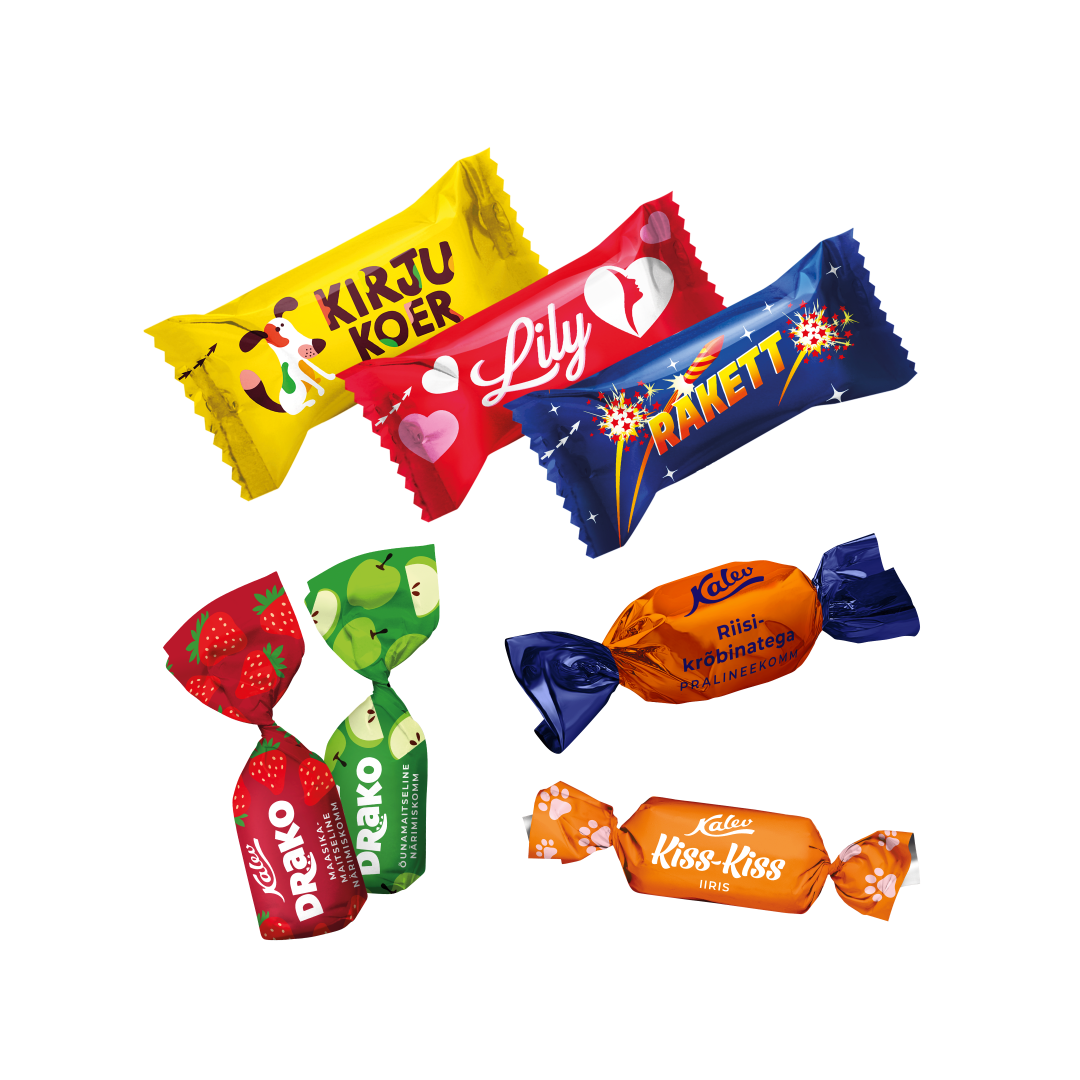 Siin kommikotis on seitset sorti komme: Drako maasika- ja õunamaitseline närimiskomm, Kaseke, Kirju koer, Kiss-kiss, Lily marmelaadikomm ja uus riisikrõbinatega pralineekomm piimašokolaadis.