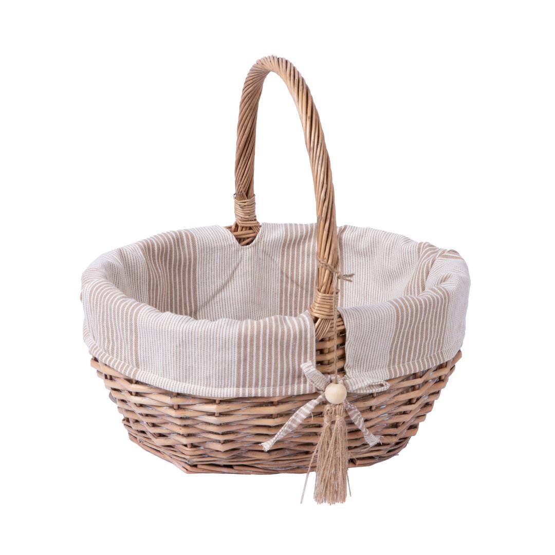 Tekstiilvooder: puuvillane triibuline kangas. Korvi materjal: käsitsi punutud naturaalne pajuvits.