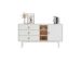 Kummut IRIS 3-sahtli ja uksega 140x40xH75cm, valge. Kummut on valmistatud 18mm MDF plaadist. Jalad ja alusraam on valmistatud täispuidust. Kummut on viimistletud vastupidava polüuretaanvärviga. Sahtlitel on nahast käepidemed. Avatud vaheriiul on vooderdatud heleda puiduvärvi plaadiga. Kummutil on ümarad välisservad.
