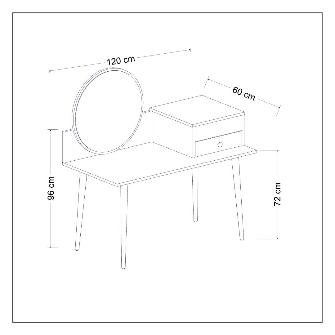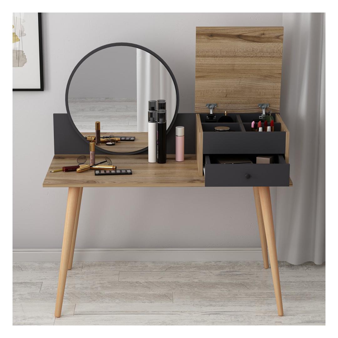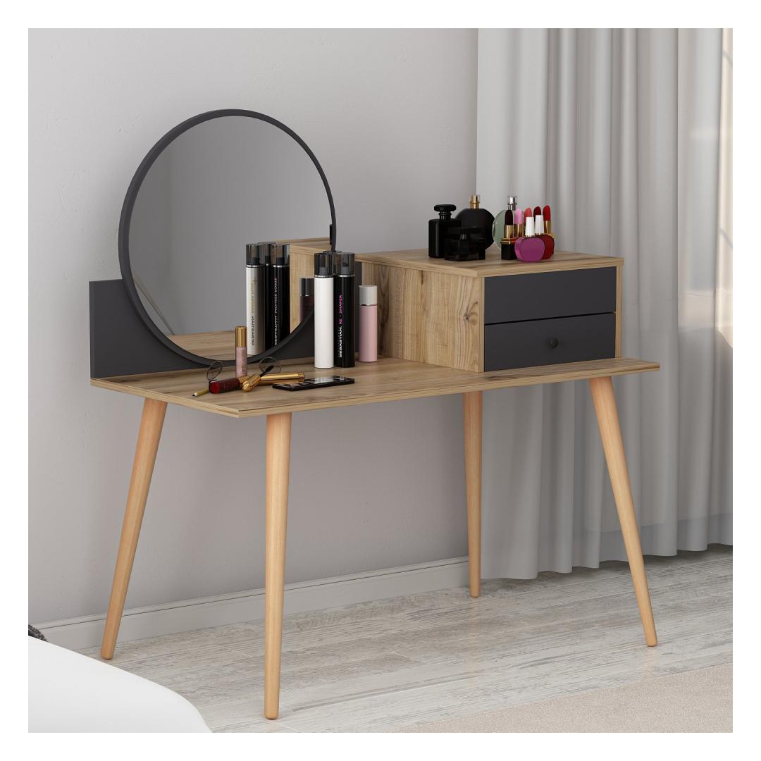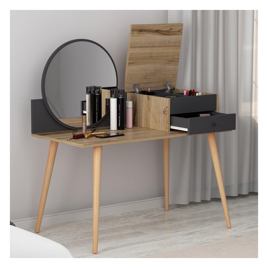 Transformeeri oma hommikune rutiin suurepärase meigilaua abilTõsta oma ilurituaal kõrgemaleHellitage luksuslikku ja isikupärastatud iluelamust meie uimastava meigilauaga. See peen mööblitükk, mis on loodud teie hommikuse rutiini täiustamiseks, muudab teie ruumi ilu ja elegantsi pühapaigaks. Võrratu kvaliteet ja vastupidavusSee meigilaud on valmistatud 100% melamiiniga kaetud puitlaastplaadist, mis on loodud kestma. 18 mm paksus tagab erakordse vastupidavuse, pakkudes stabiilset ja usaldusväärset pinda kõigile teie ilutarvikutele. Rikkalik hoiuruum teie ilukollektsiooni jaoksSee meigilaua on varustatud ruumika laua all oleva klaviatuurialusega, kahe sahtliga ja arvukate riiulitega, mis pakub piisavalt ruumi kõigile teie kosmeetikatoodetele, pintslitele ja aksessuaaridele. Hoidke oma ilukollektsioon korrastatult ja hõlpsasti kättesaadavana, muutes hommikuse rutiini lihtsaks. Sleek ja moodne disainOma soliidse värvi ja moodsa uudse kontseptsiooniga lisab see meigilaud igasse ruumi elegantsi. Antratsiidi ja pähklipuu värvi kombinatsioon loob uimastava visuaalse kontrasti, muutes selle teie ruumi keskpunktiks. Monitoorne ja ruumi säästevSeda meigilaua saab hõlpsasti seinale kinnitada, säästes sellega väärtuslikku ruumi põrandapinda. Kompaktsete mõõtmete (120 cm laius, 96 cm kõrgus ja 60 cm sügavus) tõttu sobib see ideaalselt väikestesse ruumidesse, pakkudes samas piisavalt pinda teie ilurutiini jaoks. Tehnilised üksikasjad:Materjal: materjal: 100% melamiiniga kaetud puitlaastplaatPaksus: 18 mmLaius: 120 cmKõrgus: 96 cmSügavus: 60 cmOmadused: 2 sahtlit, arvukalt riiuleid.Värv: Antratsiit ja pähkelpuuKontseptsioon: Värviline, kaasaegne - uudne Värv: Anthracite Walnut
