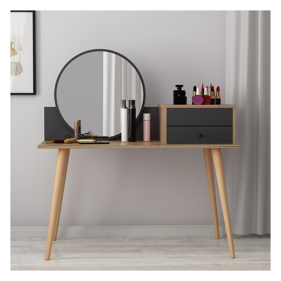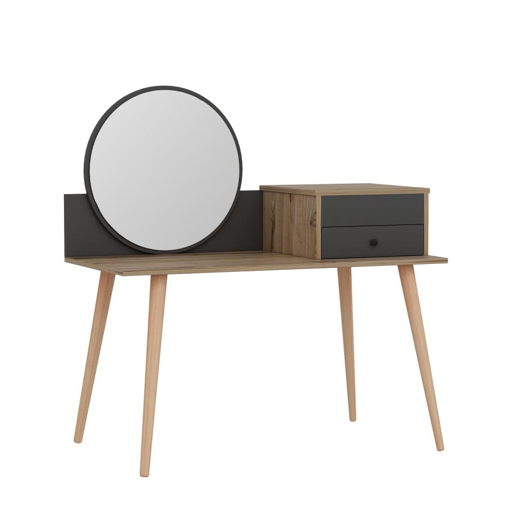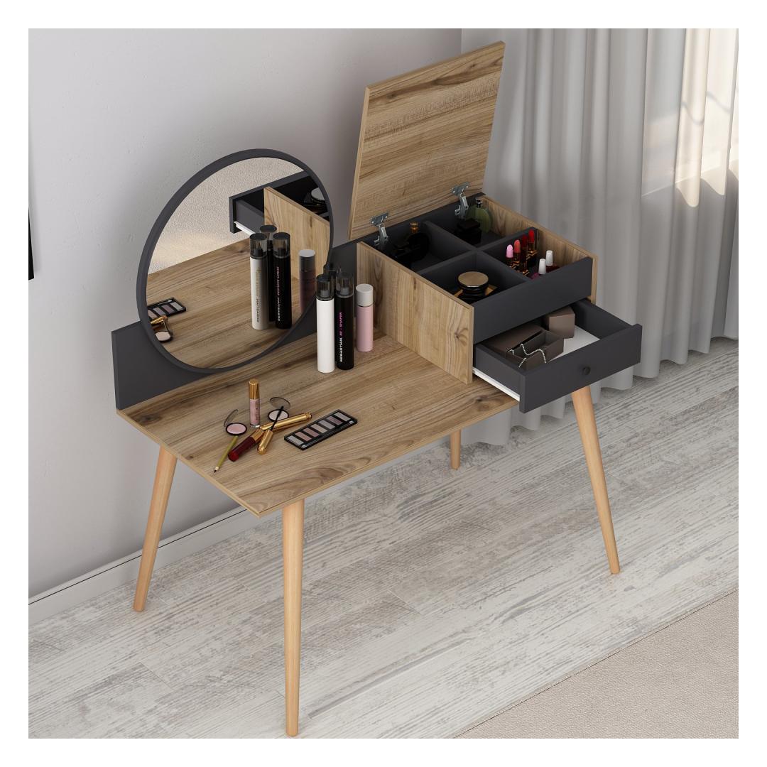 Transformeeri oma hommikune rutiin suurepärase meigilaua abilTõsta oma ilurituaal kõrgemaleHellitage luksuslikku ja isikupärastatud iluelamust meie uimastava meigilauaga. See peen mööblitükk, mis on loodud teie hommikuse rutiini täiustamiseks, muudab teie ruumi ilu ja elegantsi pühapaigaks. Võrratu kvaliteet ja vastupidavusSee meigilaud on valmistatud 100% melamiiniga kaetud puitlaastplaadist, mis on loodud kestma. 18 mm paksus tagab erakordse vastupidavuse, pakkudes stabiilset ja usaldusväärset pinda kõigile teie ilutarvikutele. Rikkalik hoiuruum teie ilukollektsiooni jaoksSee meigilaua on varustatud ruumika laua all oleva klaviatuurialusega, kahe sahtliga ja arvukate riiulitega, mis pakub piisavalt ruumi kõigile teie kosmeetikatoodetele, pintslitele ja aksessuaaridele. Hoidke oma ilukollektsioon korrastatult ja hõlpsasti kättesaadavana, muutes hommikuse rutiini lihtsaks. Sleek ja moodne disainOma soliidse värvi ja moodsa uudse kontseptsiooniga lisab see meigilaud igasse ruumi elegantsi. Antratsiidi ja pähklipuu värvi kombinatsioon loob uimastava visuaalse kontrasti, muutes selle teie ruumi keskpunktiks. Monitoorne ja ruumi säästevSeda meigilaua saab hõlpsasti seinale kinnitada, säästes sellega väärtuslikku ruumi põrandapinda. Kompaktsete mõõtmete (120 cm laius, 96 cm kõrgus ja 60 cm sügavus) tõttu sobib see ideaalselt väikestesse ruumidesse, pakkudes samas piisavalt pinda teie ilurutiini jaoks. Tehnilised üksikasjad:Materjal: materjal: 100% melamiiniga kaetud puitlaastplaatPaksus: 18 mmLaius: 120 cmKõrgus: 96 cmSügavus: 60 cmOmadused: 2 sahtlit, arvukalt riiuleid.Värv: Antratsiit ja pähkelpuuKontseptsioon: Värviline, kaasaegne - uudne Värv: Anthracite Walnut