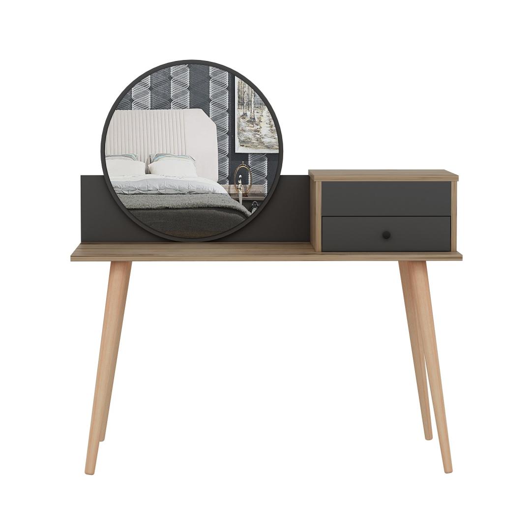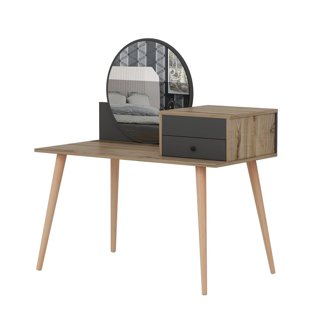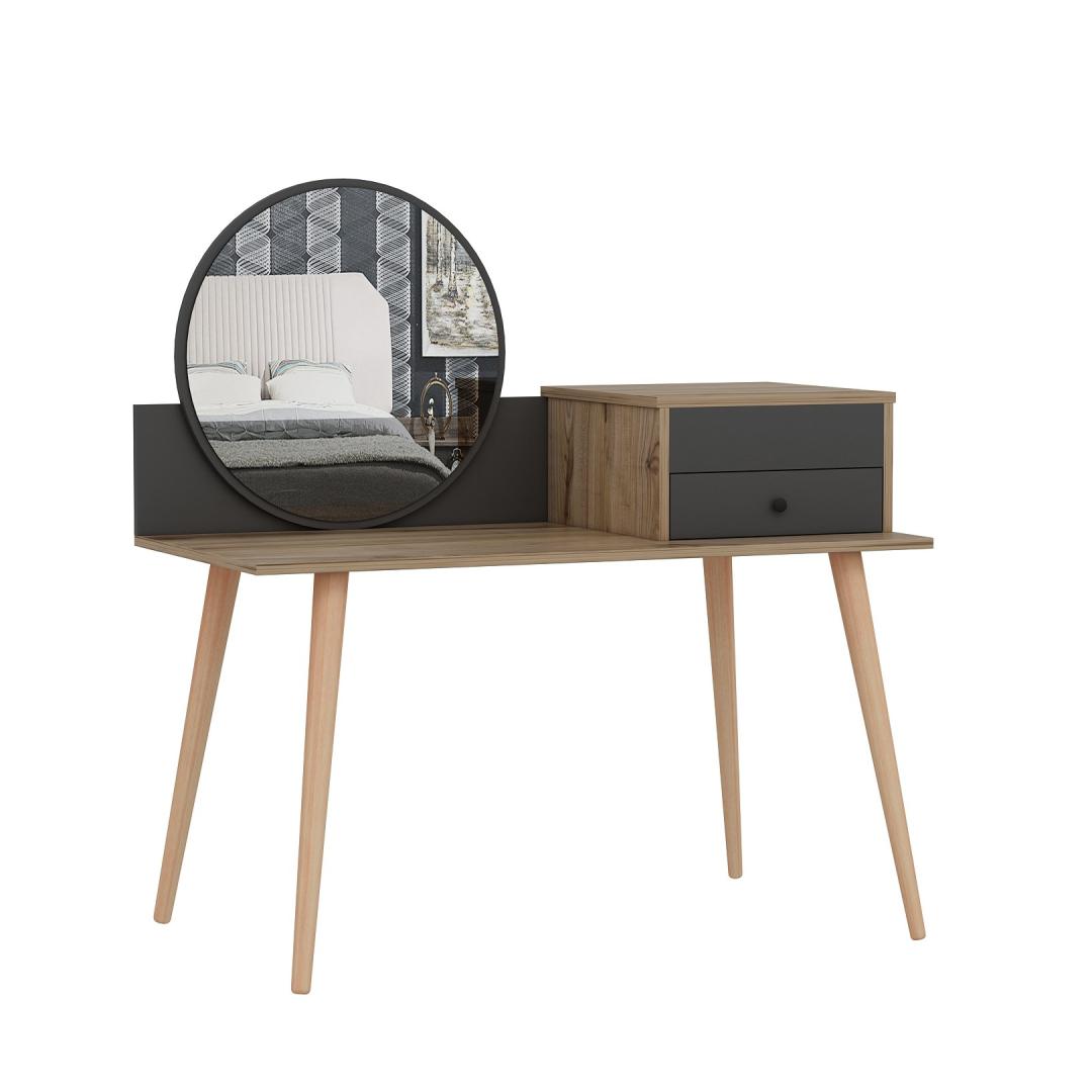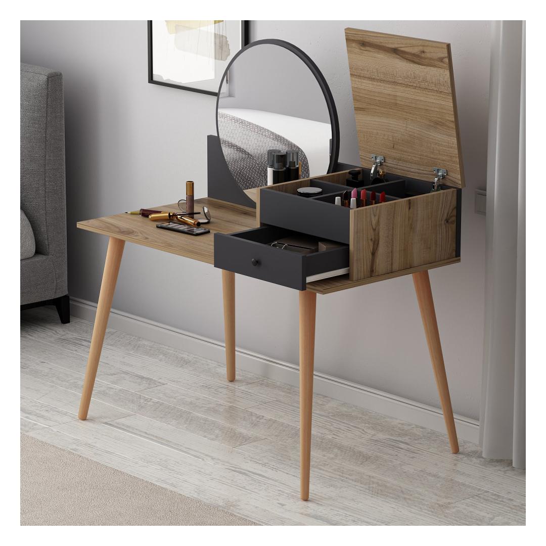 Transformeeri oma hommikune rutiin suurepärase meigilaua abilTõsta oma ilurituaal kõrgemaleHellitage luksuslikku ja isikupärastatud iluelamust meie uimastava meigilauaga. See peen mööblitükk, mis on loodud teie hommikuse rutiini täiustamiseks, muudab teie ruumi ilu ja elegantsi pühapaigaks. Võrratu kvaliteet ja vastupidavusSee meigilaud on valmistatud 100% melamiiniga kaetud puitlaastplaadist, mis on loodud kestma. 18 mm paksus tagab erakordse vastupidavuse, pakkudes stabiilset ja usaldusväärset pinda kõigile teie ilutarvikutele. Rikkalik hoiuruum teie ilukollektsiooni jaoksSee meigilaua on varustatud ruumika laua all oleva klaviatuurialusega, kahe sahtliga ja arvukate riiulitega, mis pakub piisavalt ruumi kõigile teie kosmeetikatoodetele, pintslitele ja aksessuaaridele. Hoidke oma ilukollektsioon korrastatult ja hõlpsasti kättesaadavana, muutes hommikuse rutiini lihtsaks. Sleek ja moodne disainOma soliidse värvi ja moodsa uudse kontseptsiooniga lisab see meigilaud igasse ruumi elegantsi. Antratsiidi ja pähklipuu värvi kombinatsioon loob uimastava visuaalse kontrasti, muutes selle teie ruumi keskpunktiks. Monitoorne ja ruumi säästevSeda meigilaua saab hõlpsasti seinale kinnitada, säästes sellega väärtuslikku ruumi põrandapinda. Kompaktsete mõõtmete (120 cm laius, 96 cm kõrgus ja 60 cm sügavus) tõttu sobib see ideaalselt väikestesse ruumidesse, pakkudes samas piisavalt pinda teie ilurutiini jaoks. Tehnilised üksikasjad:Materjal: materjal: 100% melamiiniga kaetud puitlaastplaatPaksus: 18 mmLaius: 120 cmKõrgus: 96 cmSügavus: 60 cmOmadused: 2 sahtlit, arvukalt riiuleid.Värv: Antratsiit ja pähkelpuuKontseptsioon: Värviline, kaasaegne - uudne Värv: Anthracite Walnut