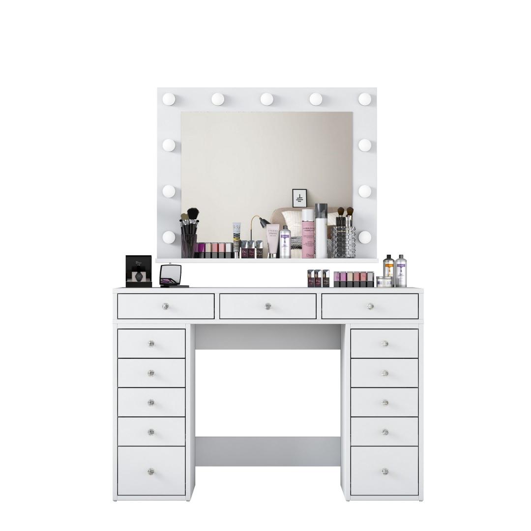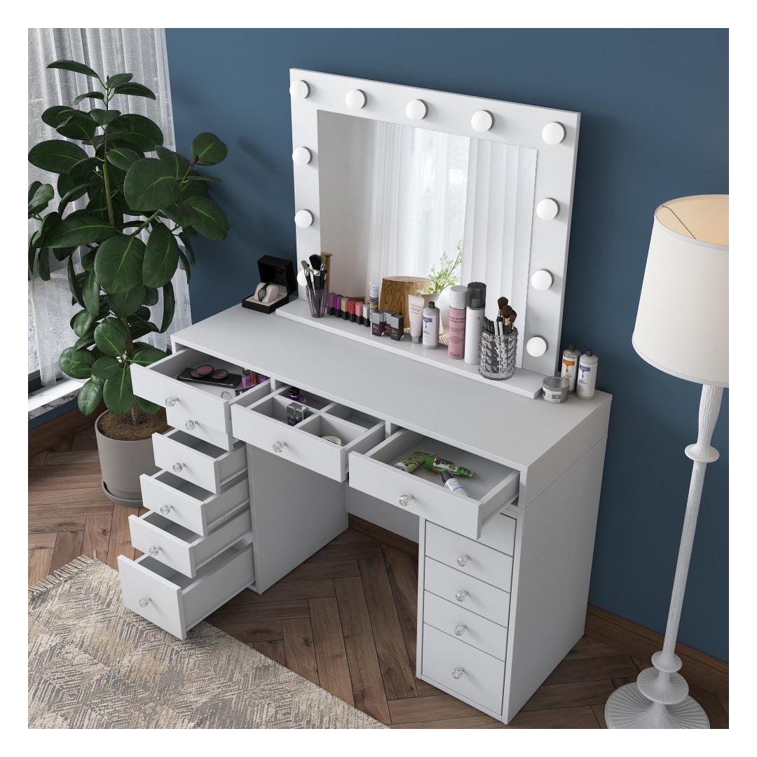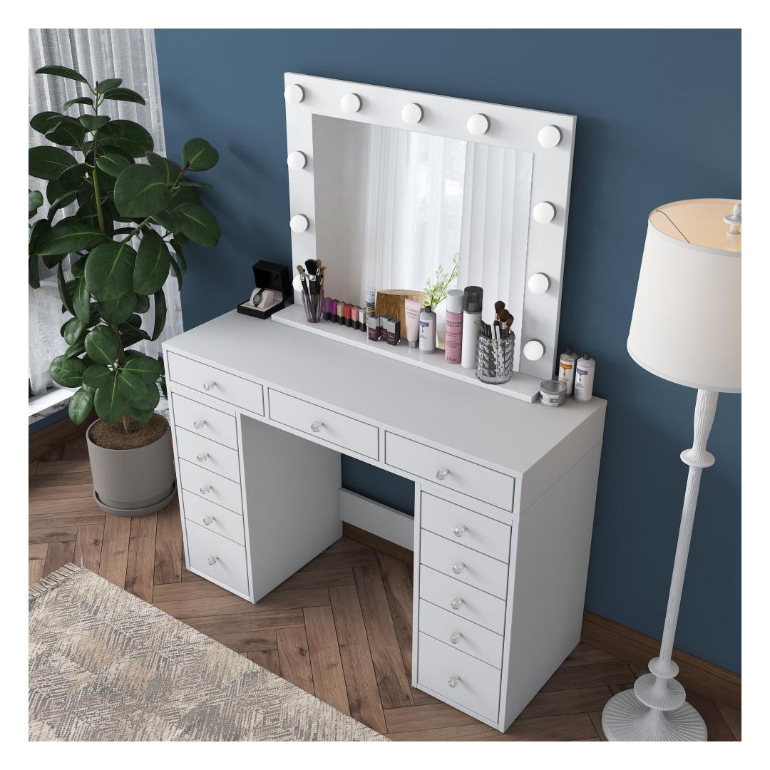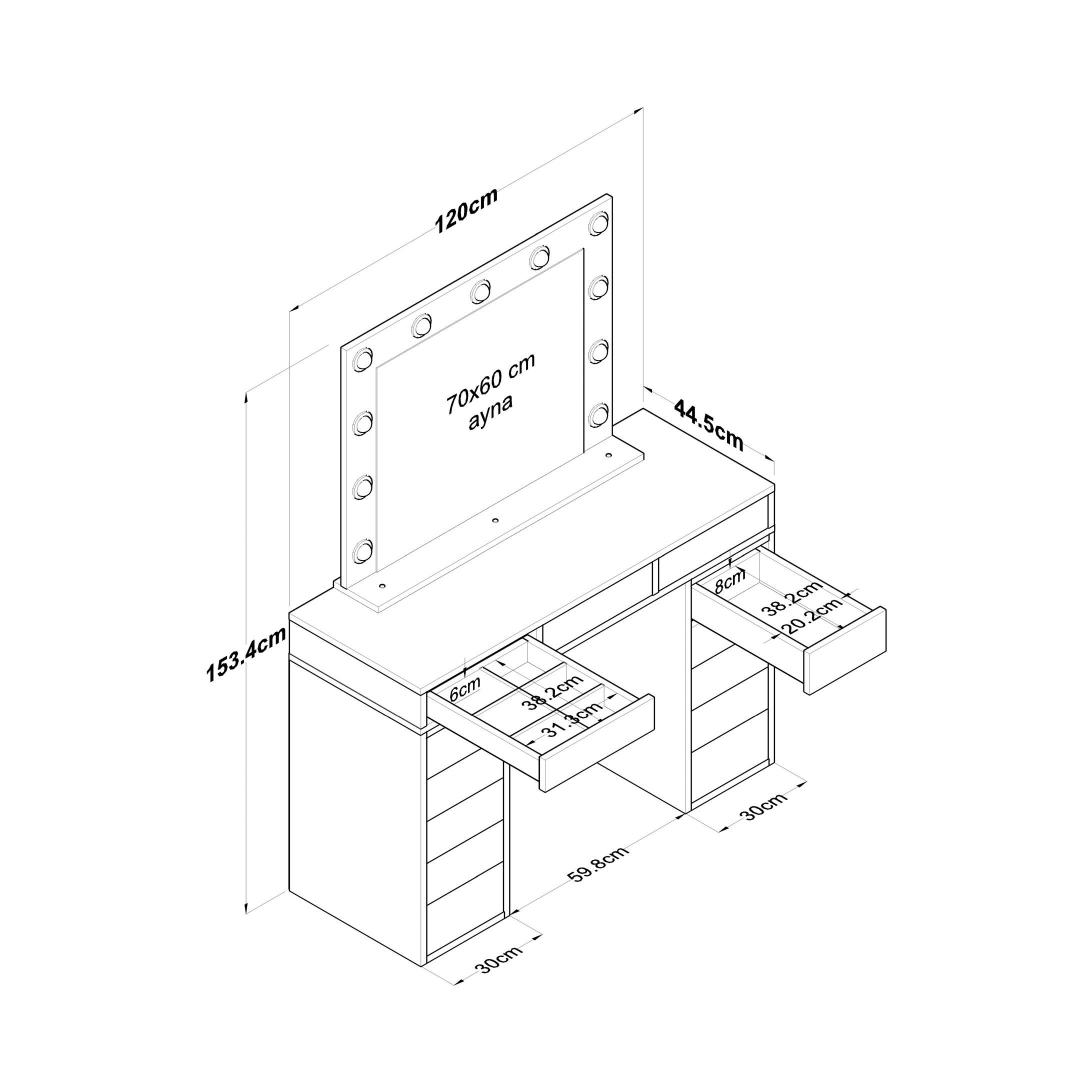 Meie meigilaua mahukas lauaplaat ja suur peegel pakuvad piisavalt ruumi kõigile teie ilutarvikutele. Peegel, millel on suured mõõtmed - 90 cm laius ja 71 cm. 8 cm kõrgus, võimaldab teil imetleda oma veatut meigirakendust iga nurga alt. Laua mõõtmed on 120 cm laius, 81,6 cm kõrgus ja 44. 5 cm sügavus pakuvad rohkelt ruumi kosmeetikatoodete, pintslite ja tarvikute jaoks.