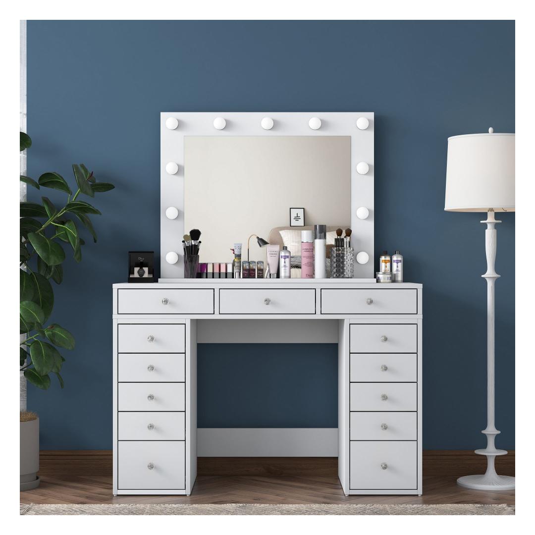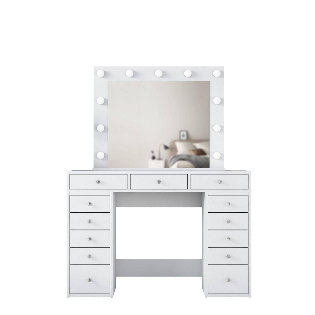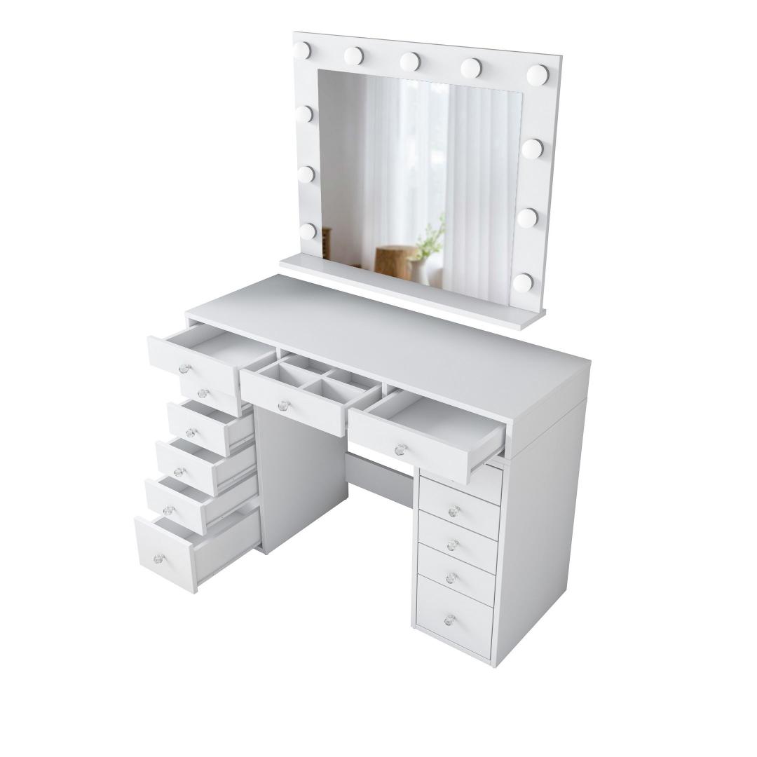 Meie meigilaua mahukas lauaplaat ja suur peegel pakuvad piisavalt ruumi kõigile teie ilutarvikutele. Peegel, millel on suured mõõtmed - 90 cm laius ja 71 cm. 8 cm kõrgus, võimaldab teil imetleda oma veatut meigirakendust iga nurga alt. Laua mõõtmed on 120 cm laius, 81,6 cm kõrgus ja 44. 5 cm sügavus pakuvad rohkelt ruumi kosmeetikatoodete, pintslite ja tarvikute jaoks.