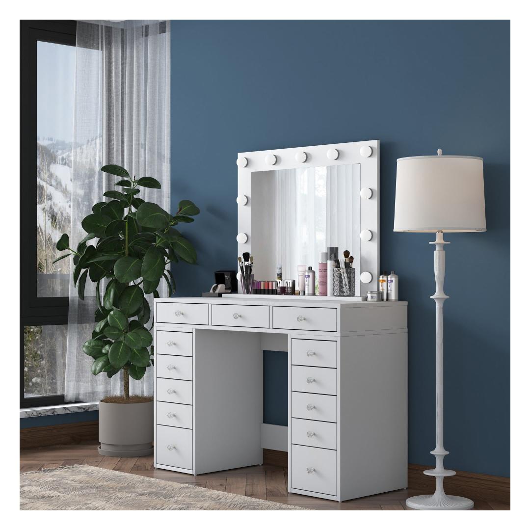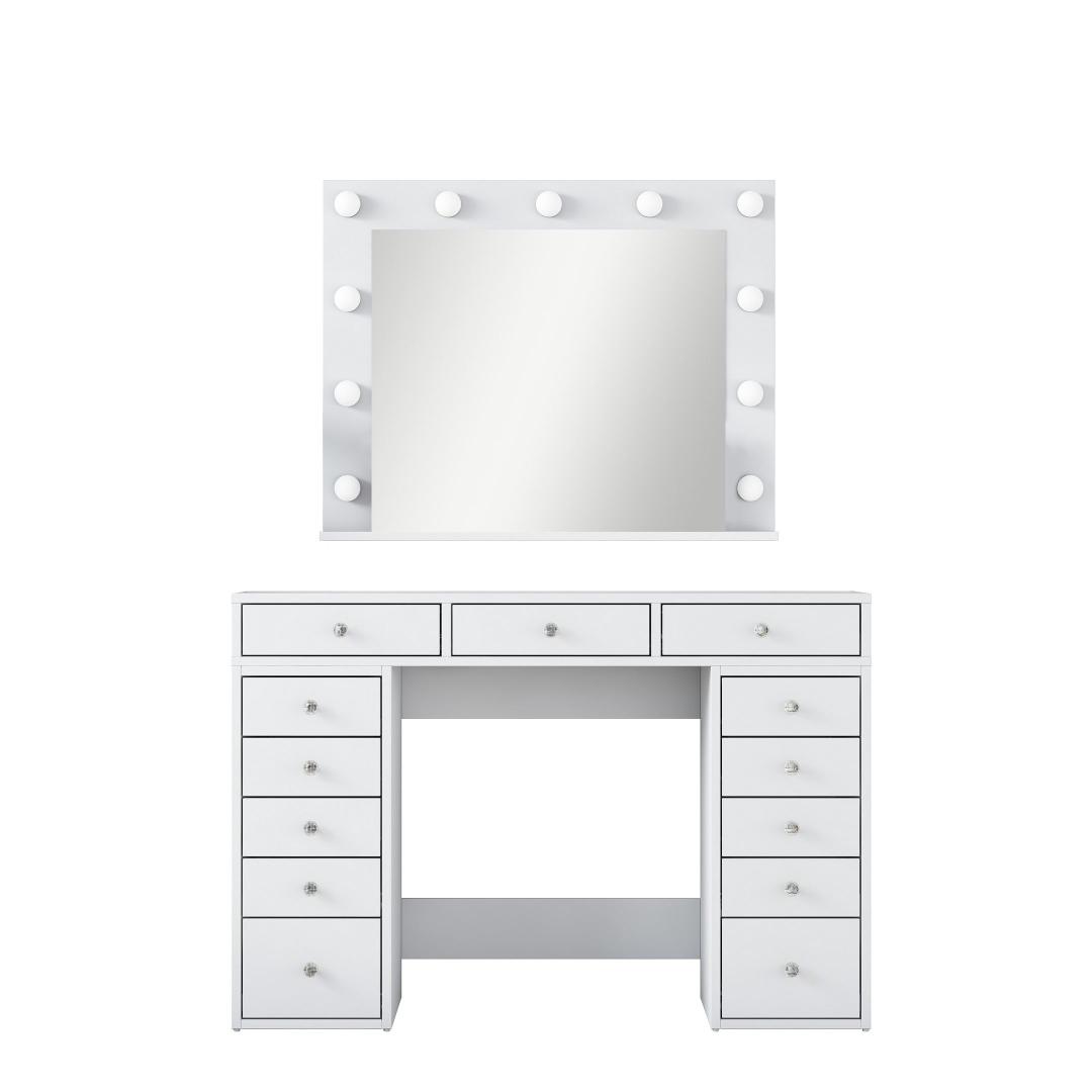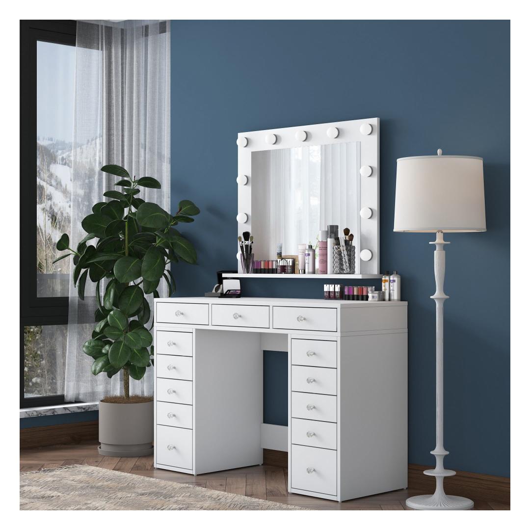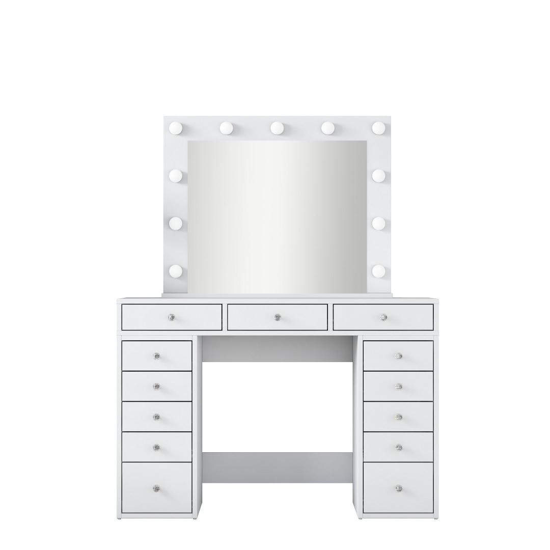 Meie meigilaua mahukas lauaplaat ja suur peegel pakuvad piisavalt ruumi kõigile teie ilutarvikutele. Peegel, millel on suured mõõtmed - 90 cm laius ja 71 cm. 8 cm kõrgus, võimaldab teil imetleda oma veatut meigirakendust iga nurga alt. Laua mõõtmed on 120 cm laius, 81,6 cm kõrgus ja 44. 5 cm sügavus pakuvad rohkelt ruumi kosmeetikatoodete, pintslite ja tarvikute jaoks.