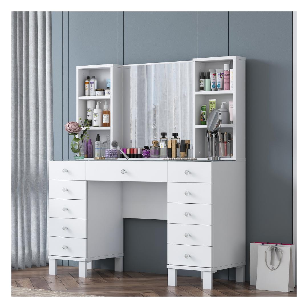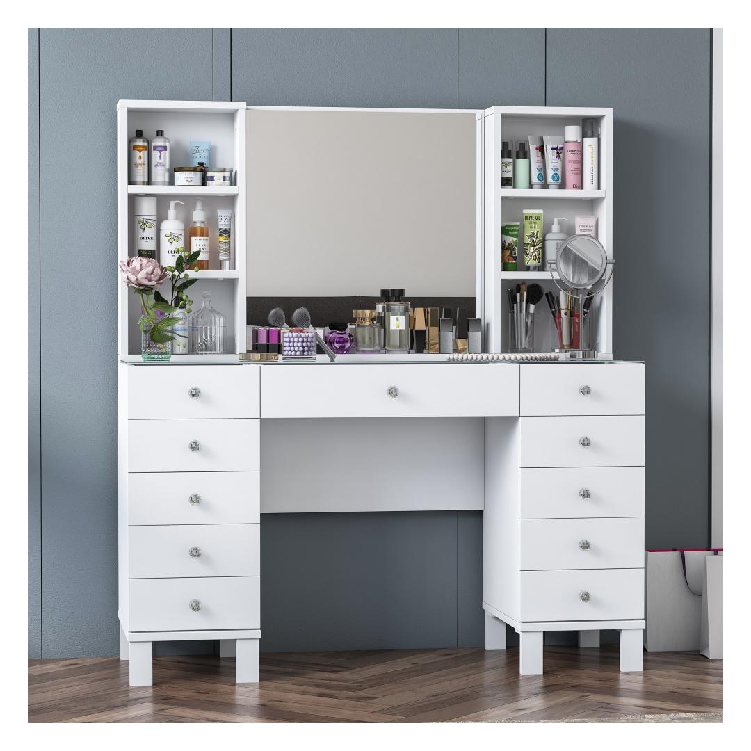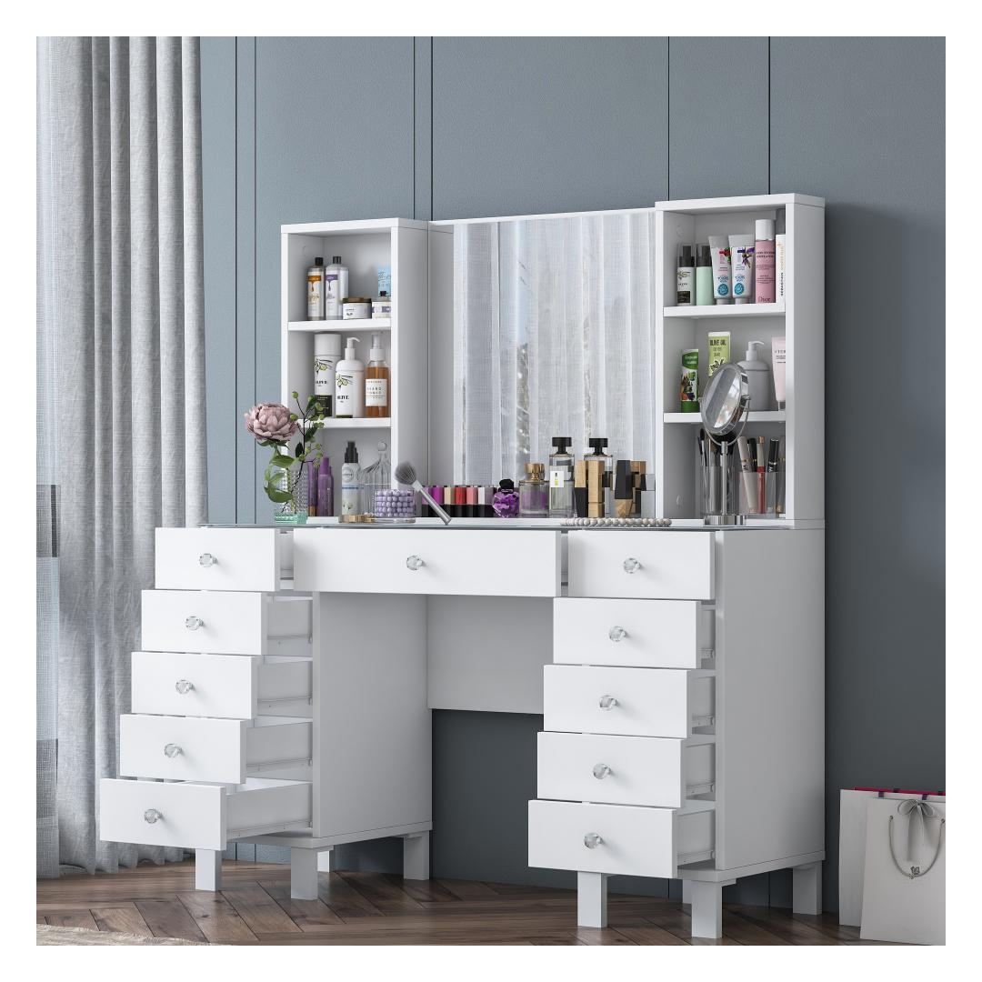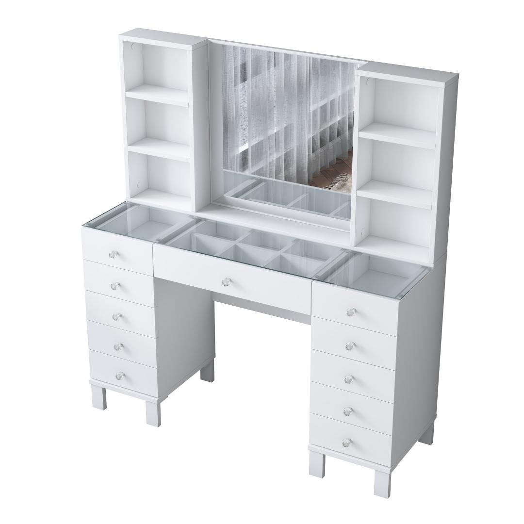 Muuda oma hommikurutiin meie kauni meigilaudaga. See elegantne mööbliese ei ole mitte ainult koht, kus hoida oma ilutooted, vaid ka püha paik, kus saad end hellitada ja tunda end nagu kuninganna. Sujuv disain ja valge värv lisavad igasse ruumi natuke rafineeritust, samas kui avar hoiuruum ja arvukad riiulid hoiavad sinu meigikollektsiooni organiseerituna ja kergesti ligipääsetavana.