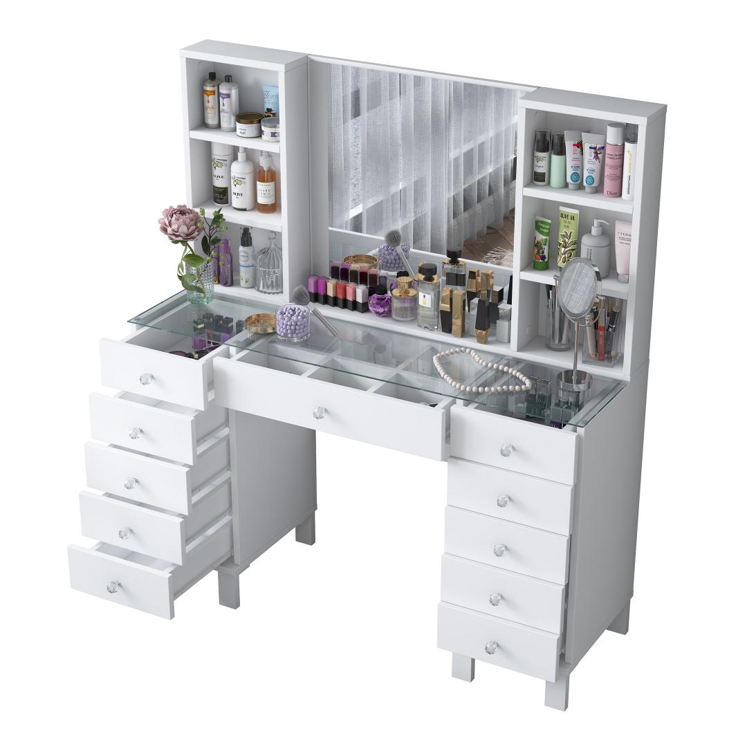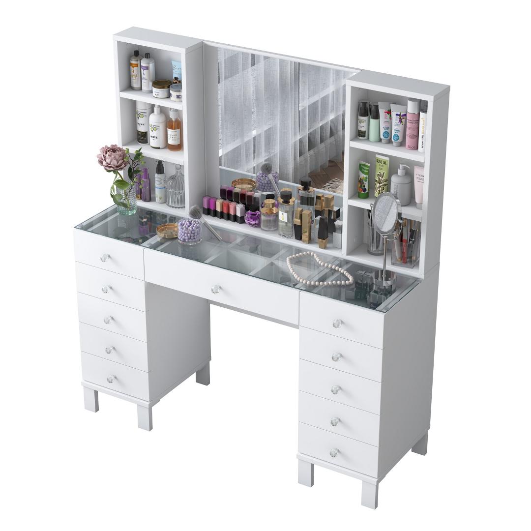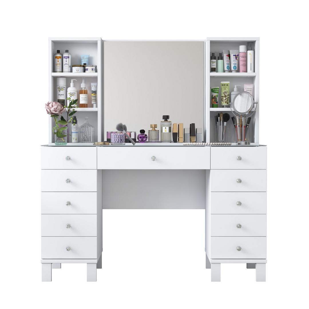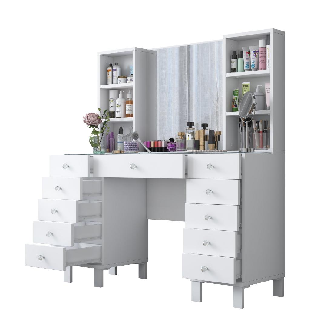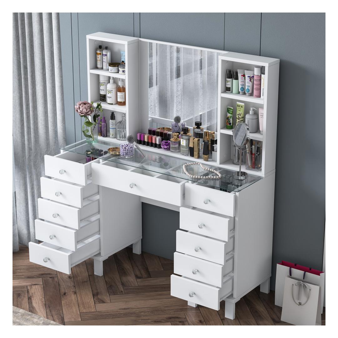Muuda oma hommikurutiin meie kauni meigilaudaga. See elegantne mööbliese ei ole mitte ainult koht, kus hoida oma ilutooted, vaid ka püha paik, kus saad end hellitada ja tunda end nagu kuninganna. Sujuv disain ja valge värv lisavad igasse ruumi natuke rafineeritust, samas kui avar hoiuruum ja arvukad riiulid hoiavad sinu meigikollektsiooni organiseerituna ja kergesti ligipääsetavana.
