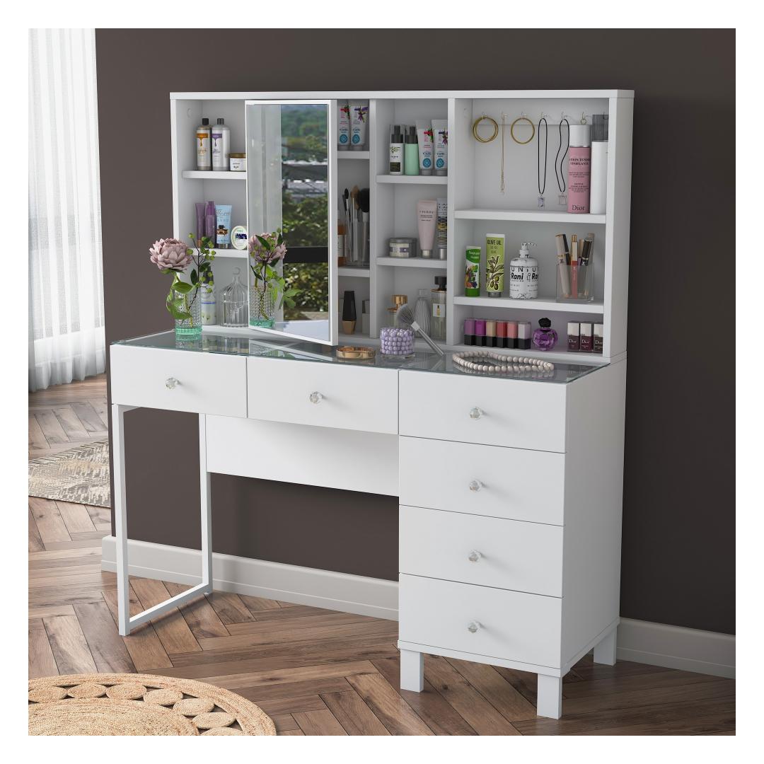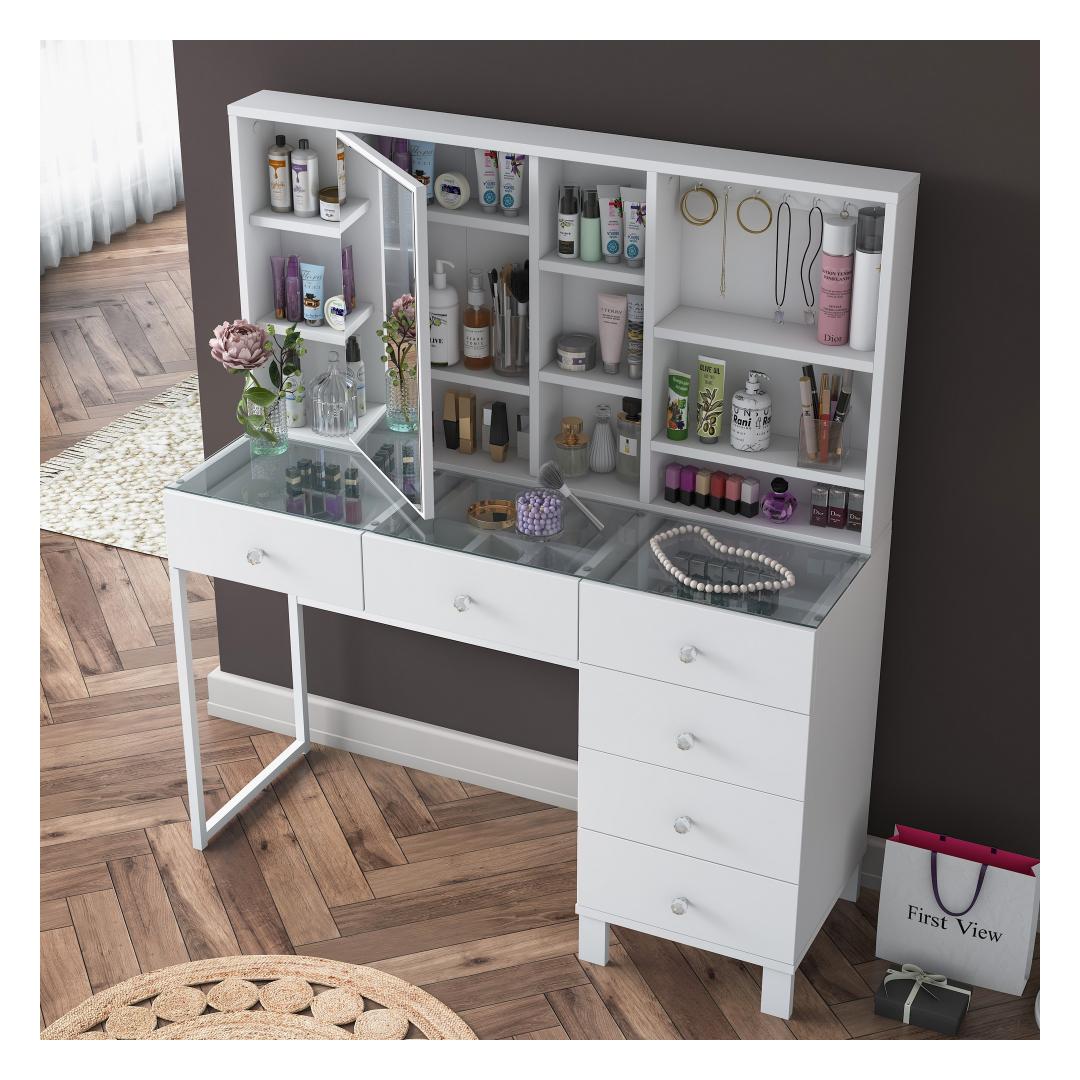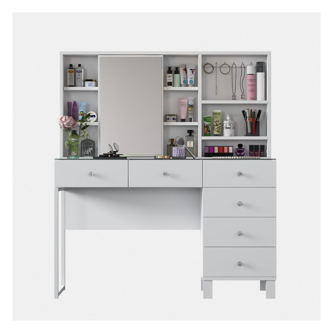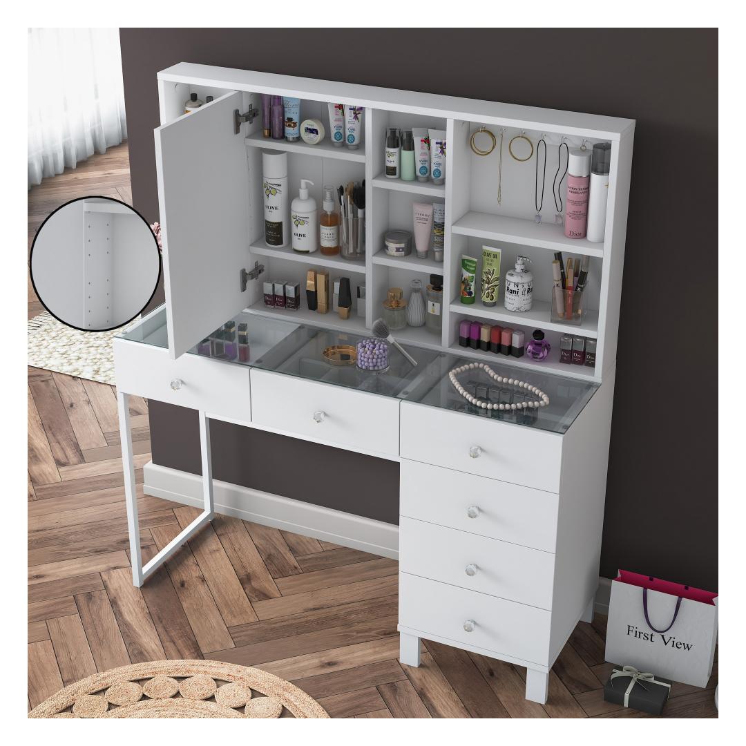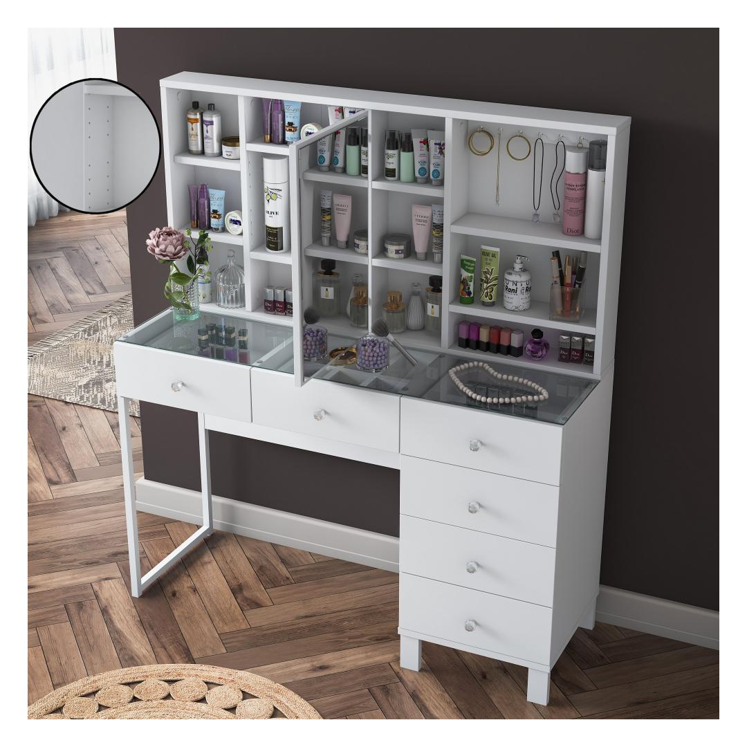 Ütle hüvasti segastele tööpindadele ja sahtlitele. Meie meigilaud sisaldab arvukalt riiuleid ja lisaruumi, et hoida kõik sinu ilutooted korralikult organiseeritud ja käeulatuses. Alates meigipintslitest kuni nahahooldustoodeteni, kõigil on oma määratud koht.