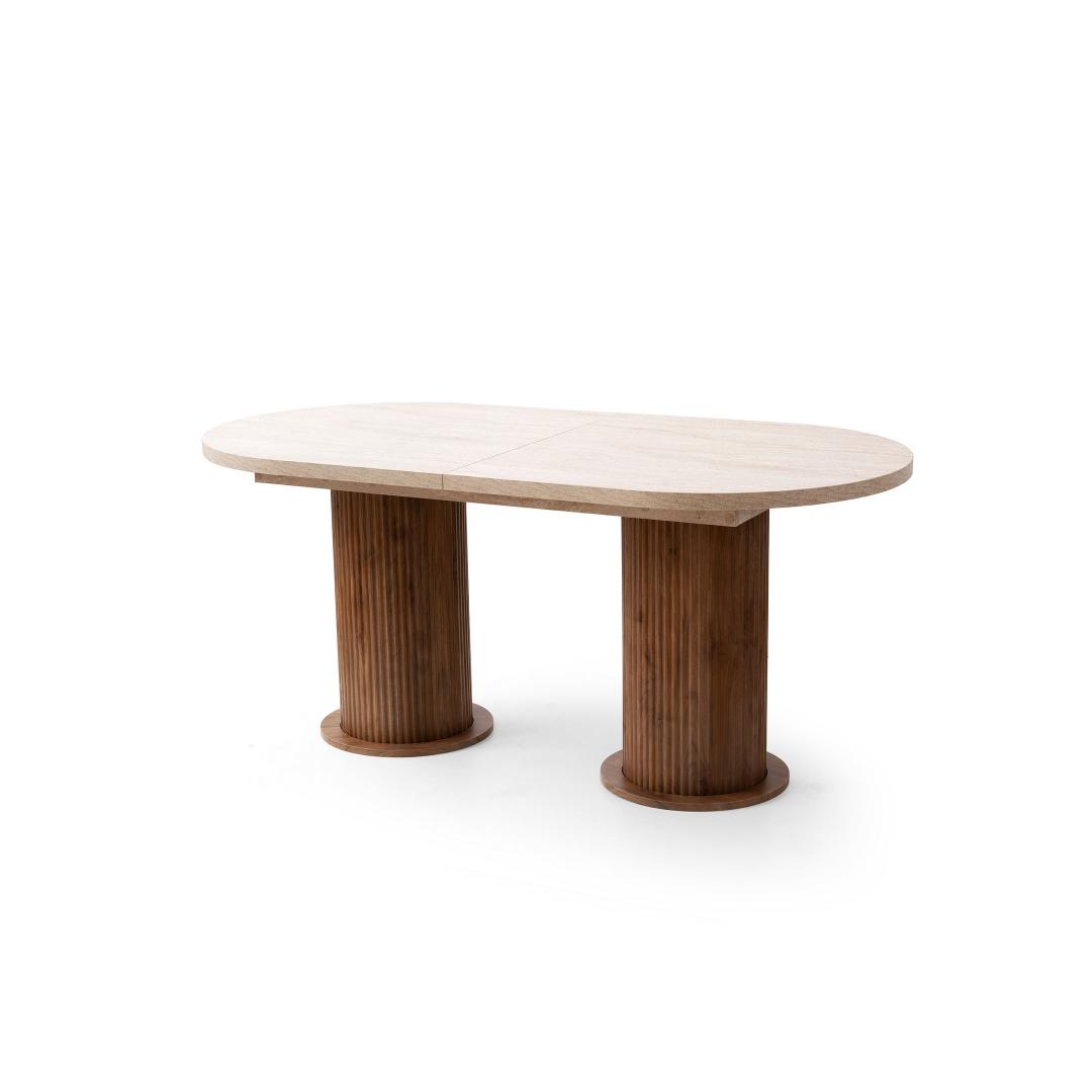 Valmistatud 100% melamiinkattega puitlaastplaadist, on see söögilaud mitte ainult vastupidav, vaid ka lihtne puhastada ja hooldada. Sujuv disain ja kaasaegne värvikombinatsioon travertiini ja pähkliga teevad sellest ideaalse lisandi igasse kodu sisustusse.
