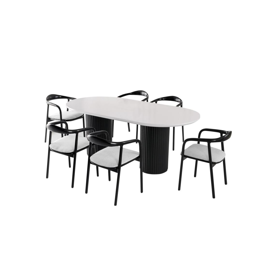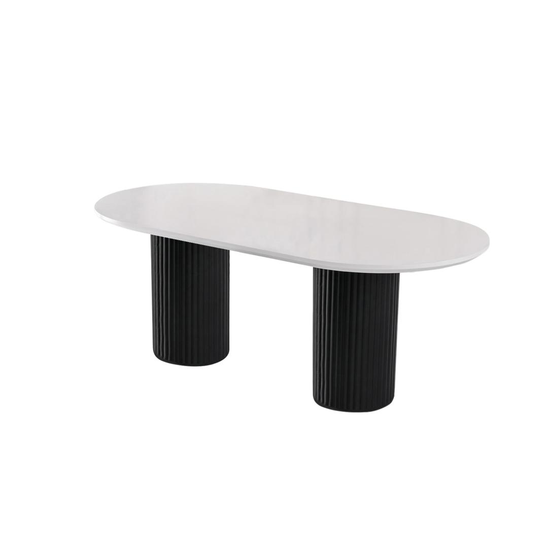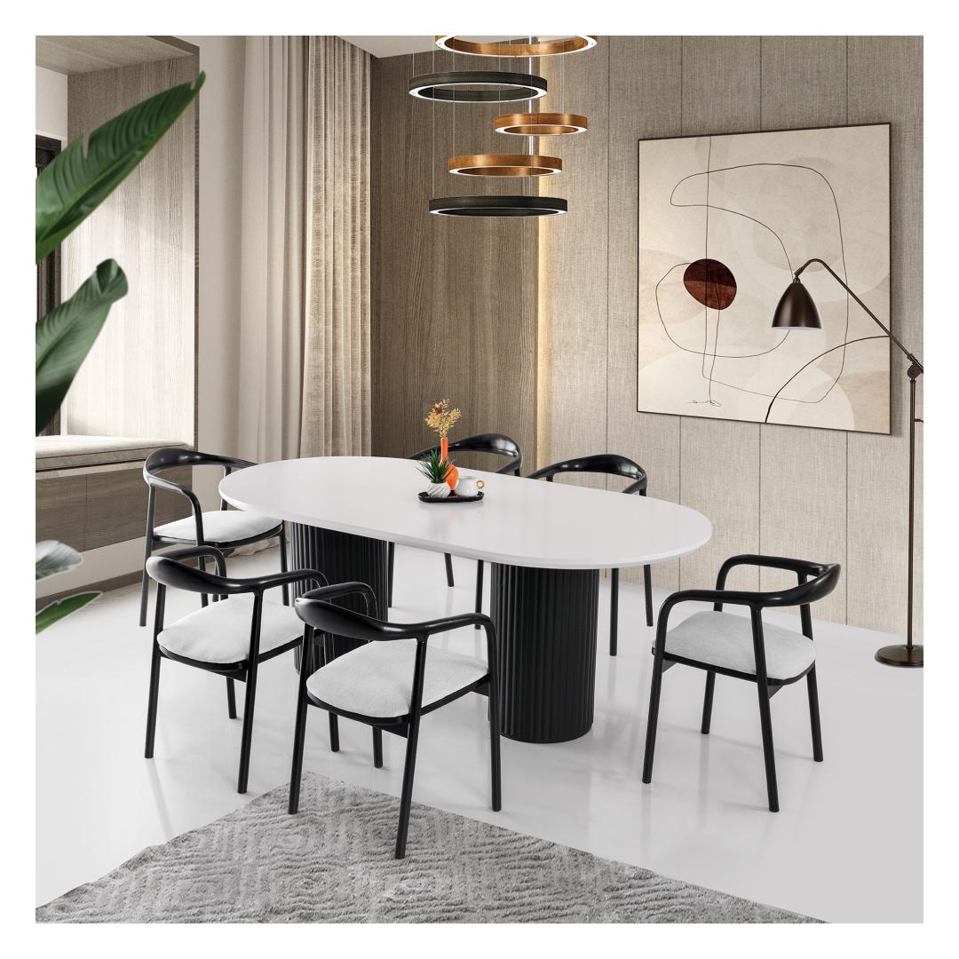 Valge ja musta värvi kontrast muudab selle söögilaua mitmekülgseks valikuks mis tahes interjööristiili jaoks. Olenemata sellest, kas teie sisekujundus on kaasaegne, minimalistlik või traditsiooniline, see laud sulandub vaevata, lisades teie ruumile elegantsi.