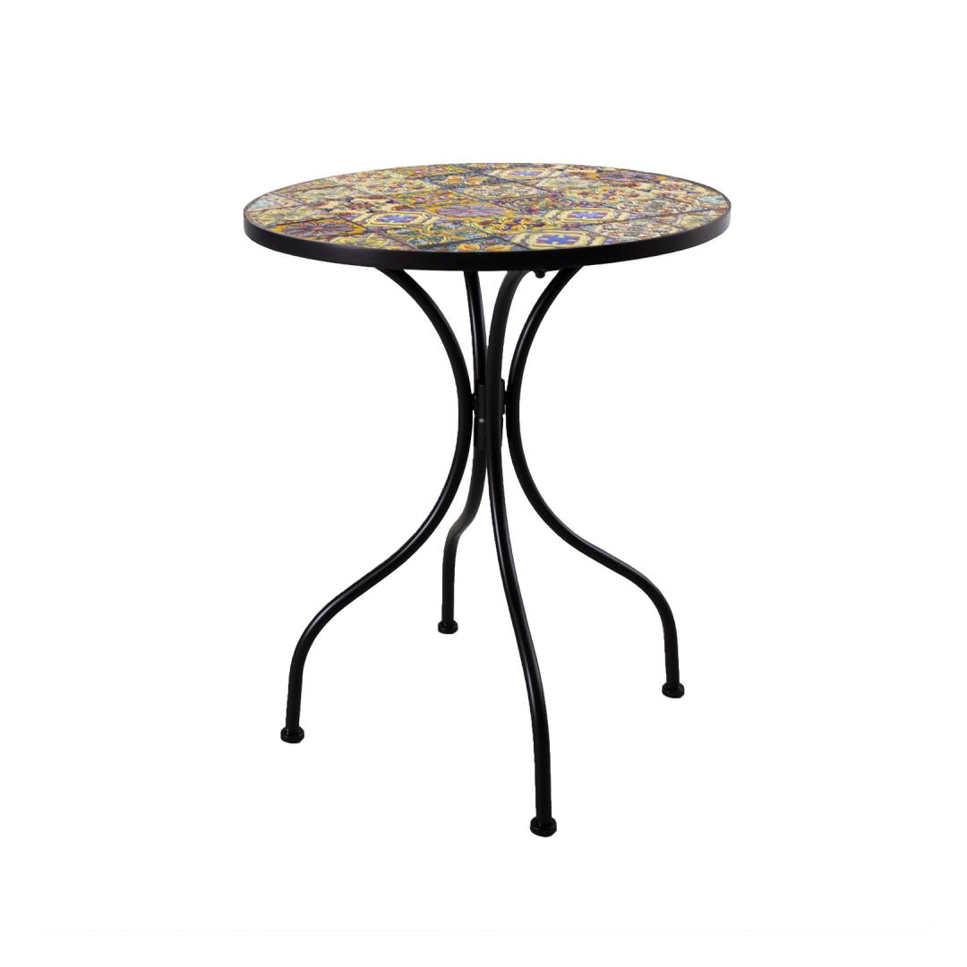 Laud MOROCCO D60xH71cm. Laua mosaiikplaat on kaetud Morocco stiilis värviliste keraamiliste plaatidega. Laua jalad ja raam on valmistatud metallist ja viimistletud musta pulbervärviga. Laud MOROCCO D60xH71cm. Laua mosaiikplaat on kaetud Morocco stiilis värviliste keraamiliste plaatidega. Laua jalad ja raam on valmistatud metallist ja viimistletud musta pulbervärviga.