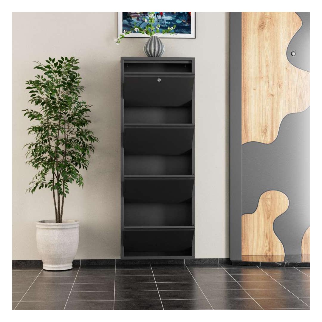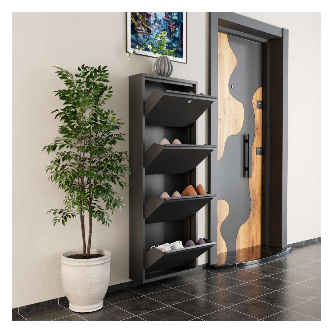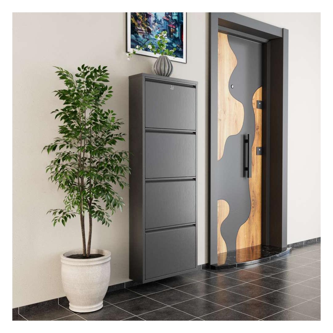 Selle modernse disaini ja antratsiidi värviga kingakapp lisab igasse ruumi elegantsi. Keskelt avanevad uksed magnethoidikutega muudavad kingadele ligipääsu lihtsaks, hoides need samas silma alt eemal. Ütle hüvasti segaste kingapakkide ja tere korrastatud ning organiseeritud ruumile.