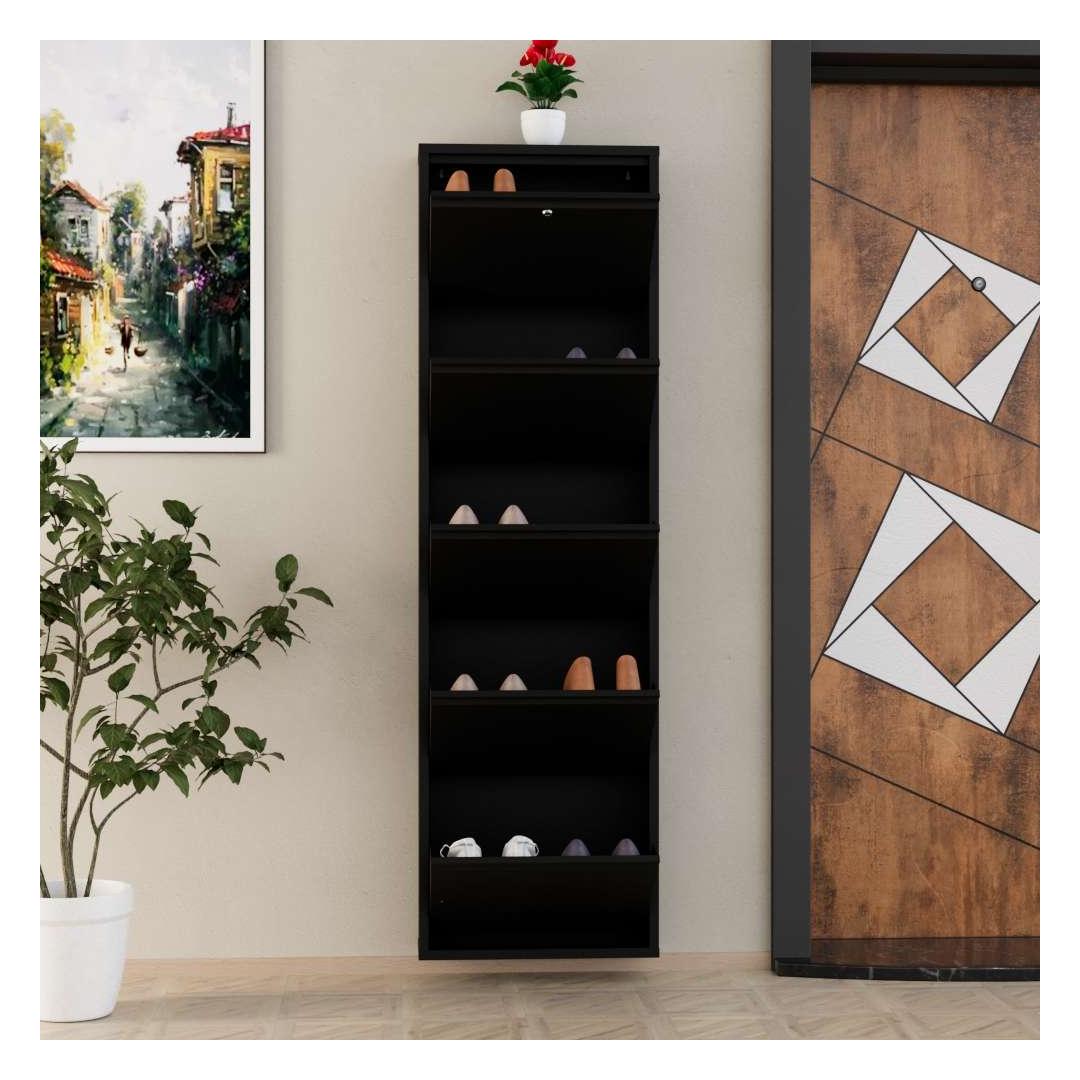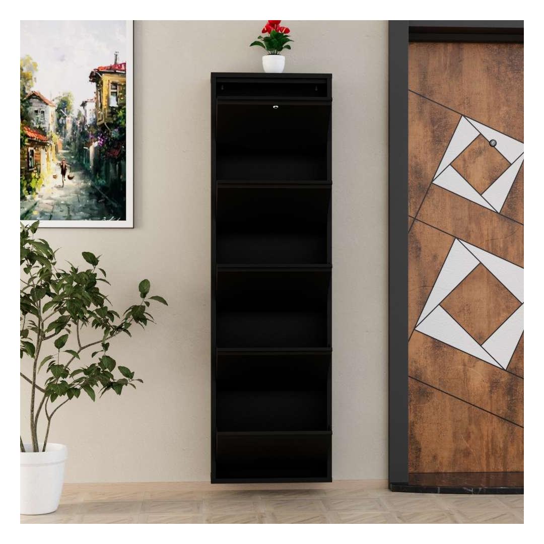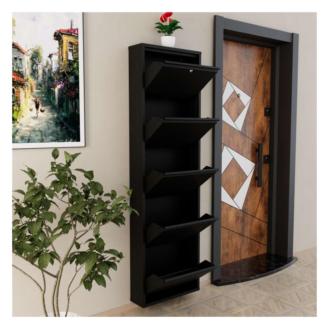 Oma modernse disaini ja musta värviga sulandub see kingakapp sujuvalt igasse kodu sisustusse, lisades sinu ruumile elegantsi. Keskelt avanevad uksed magnethoidikutega mitte ainult ei võimalda lihtsat juurdepääsu sinu kingadele, vaid hoiavad neid ka kindlalt paigal.