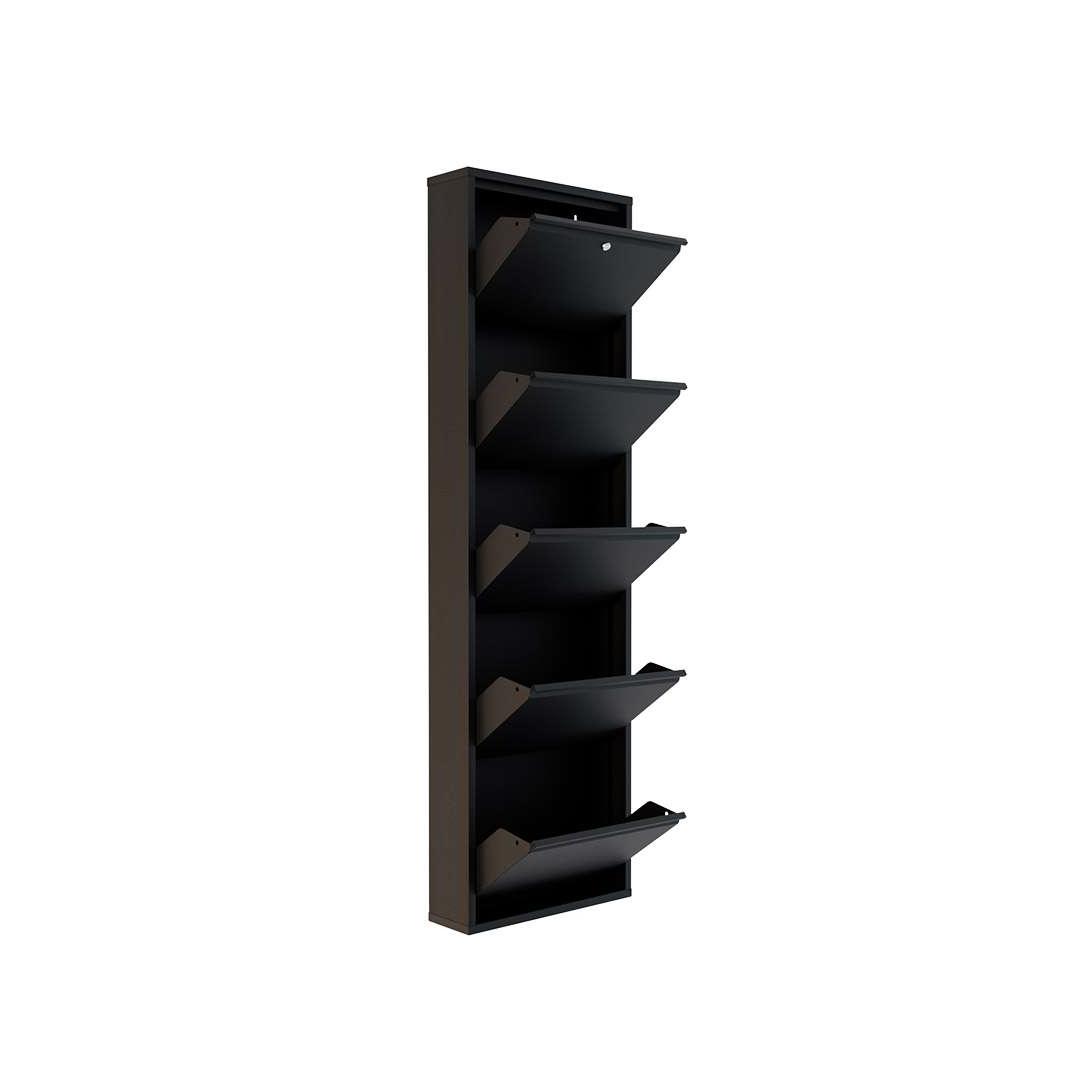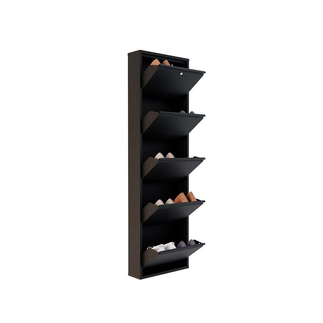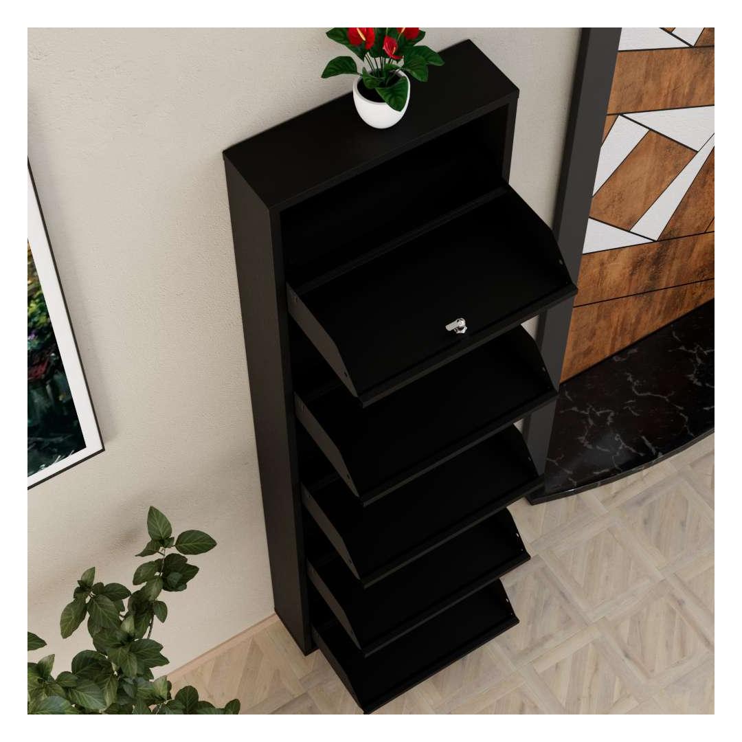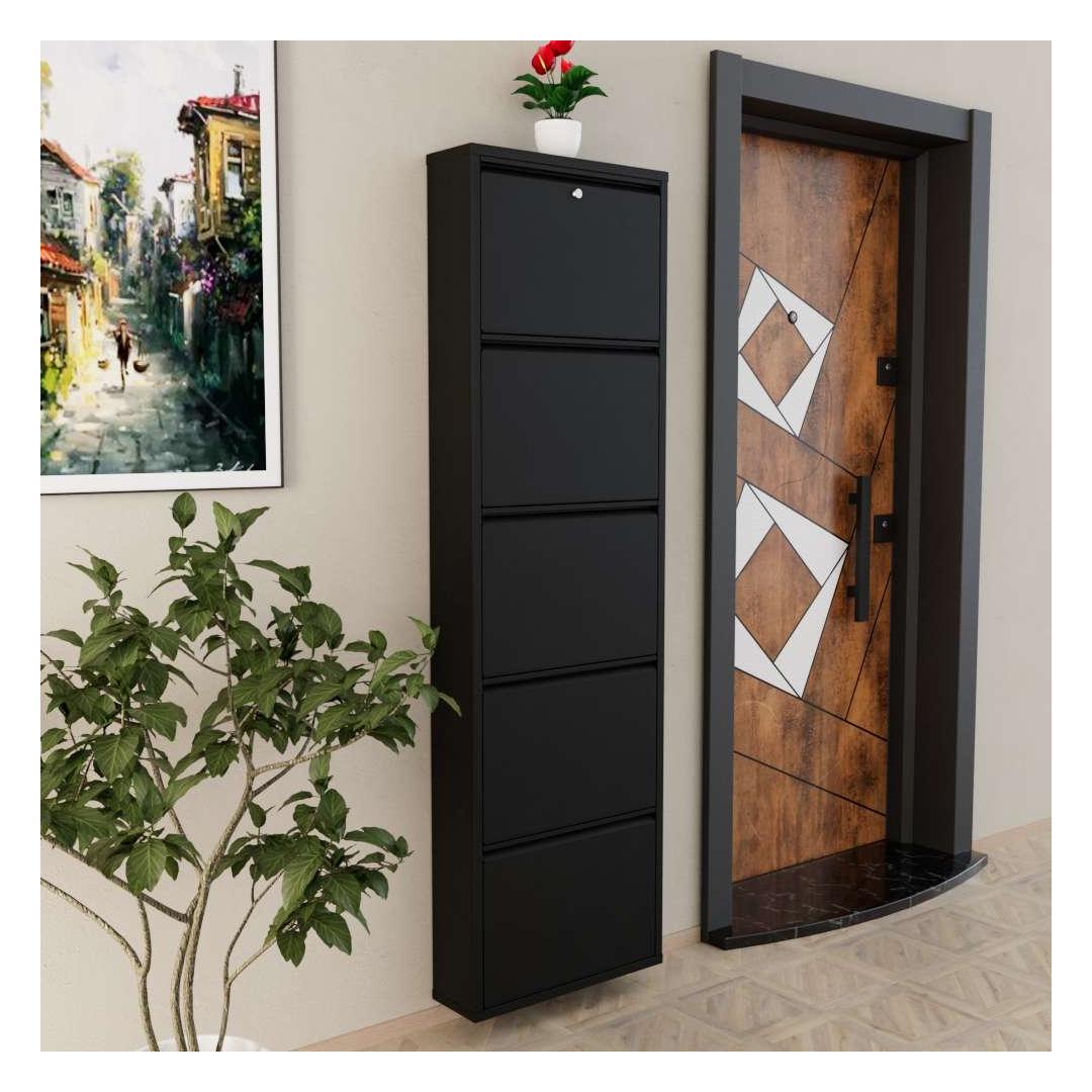 Oma modernse disaini ja musta värviga sulandub see kingakapp sujuvalt igasse kodu sisustusse, lisades sinu ruumile elegantsi. Keskelt avanevad uksed magnethoidikutega mitte ainult ei võimalda lihtsat juurdepääsu sinu kingadele, vaid hoiavad neid ka kindlalt paigal.