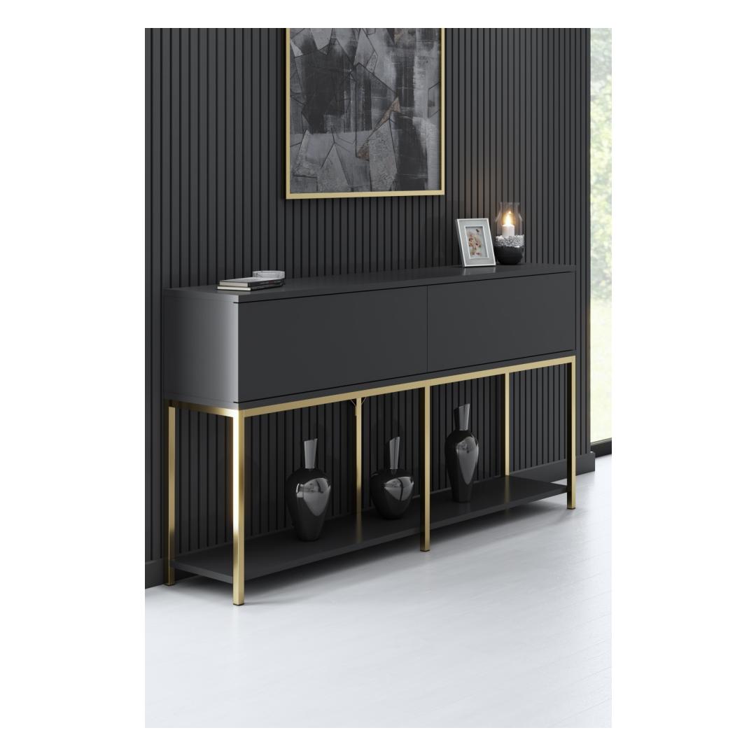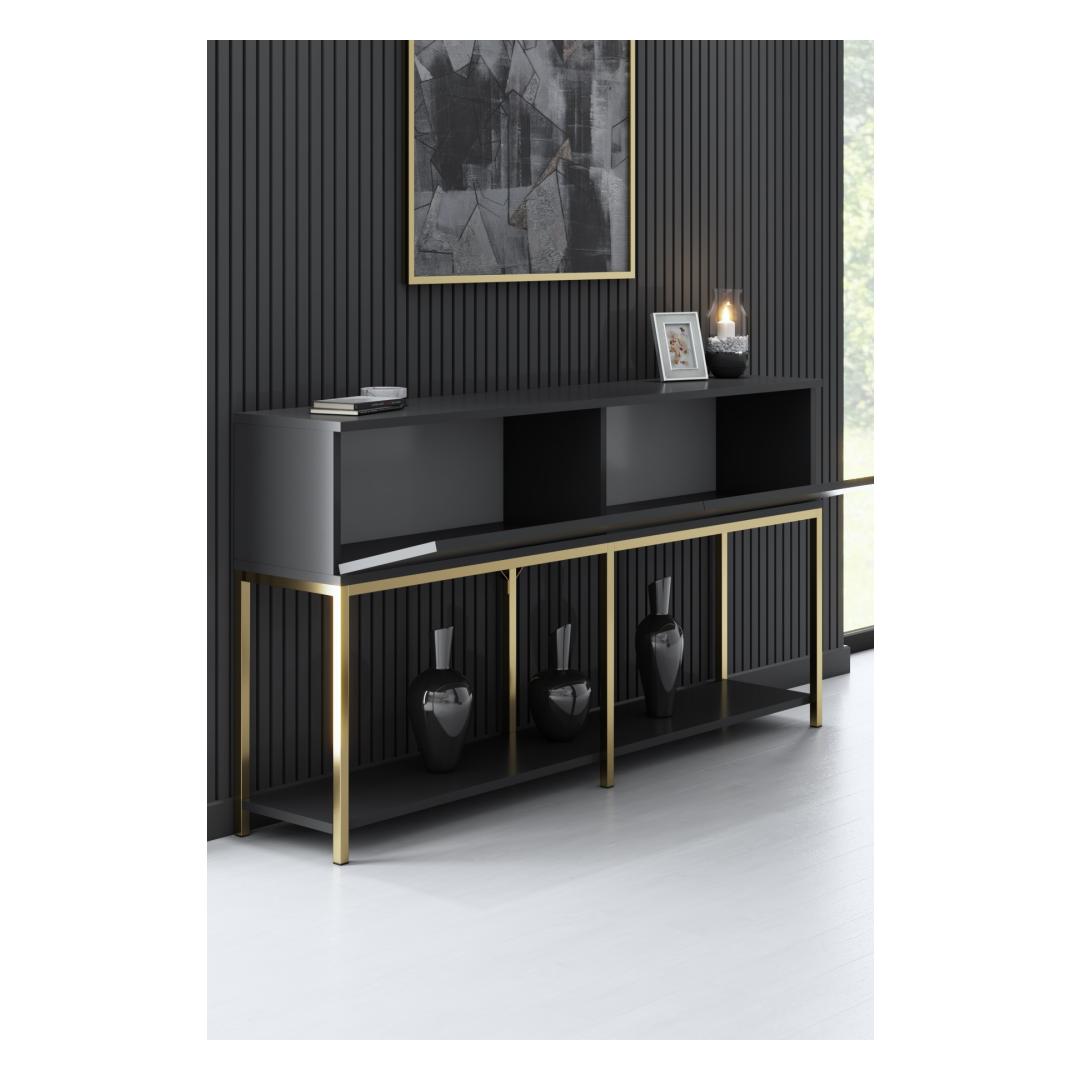 Tutvustame meie uimastavat antratsiidi ja kulla värvi konsooli, mis on tõeline meistriteos, mis lisab elegantsi ja rafineeritust igasse ruumi. See konsool ei ole lihtsalt mööblitükk, vaid stiili ja luksuse avaldus.