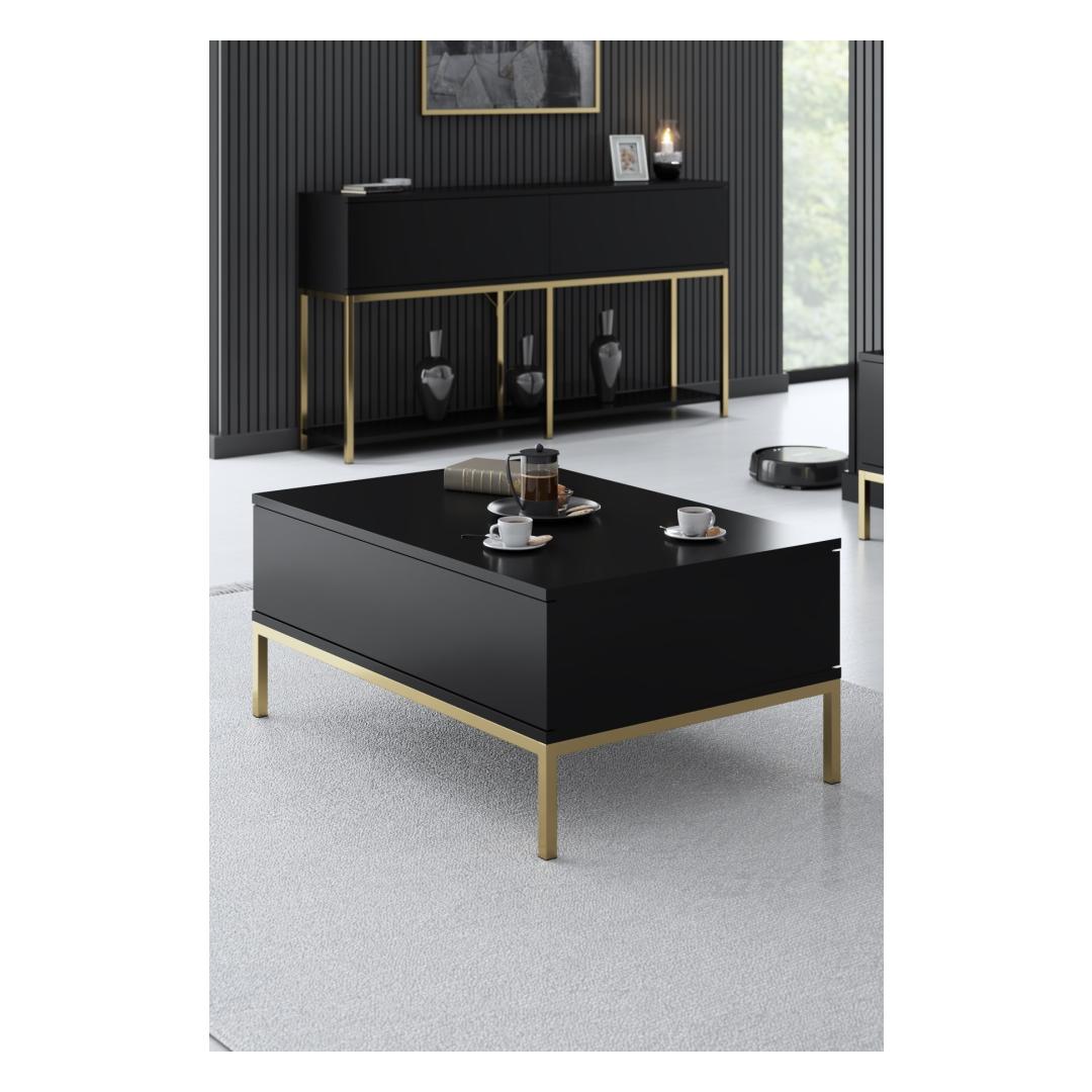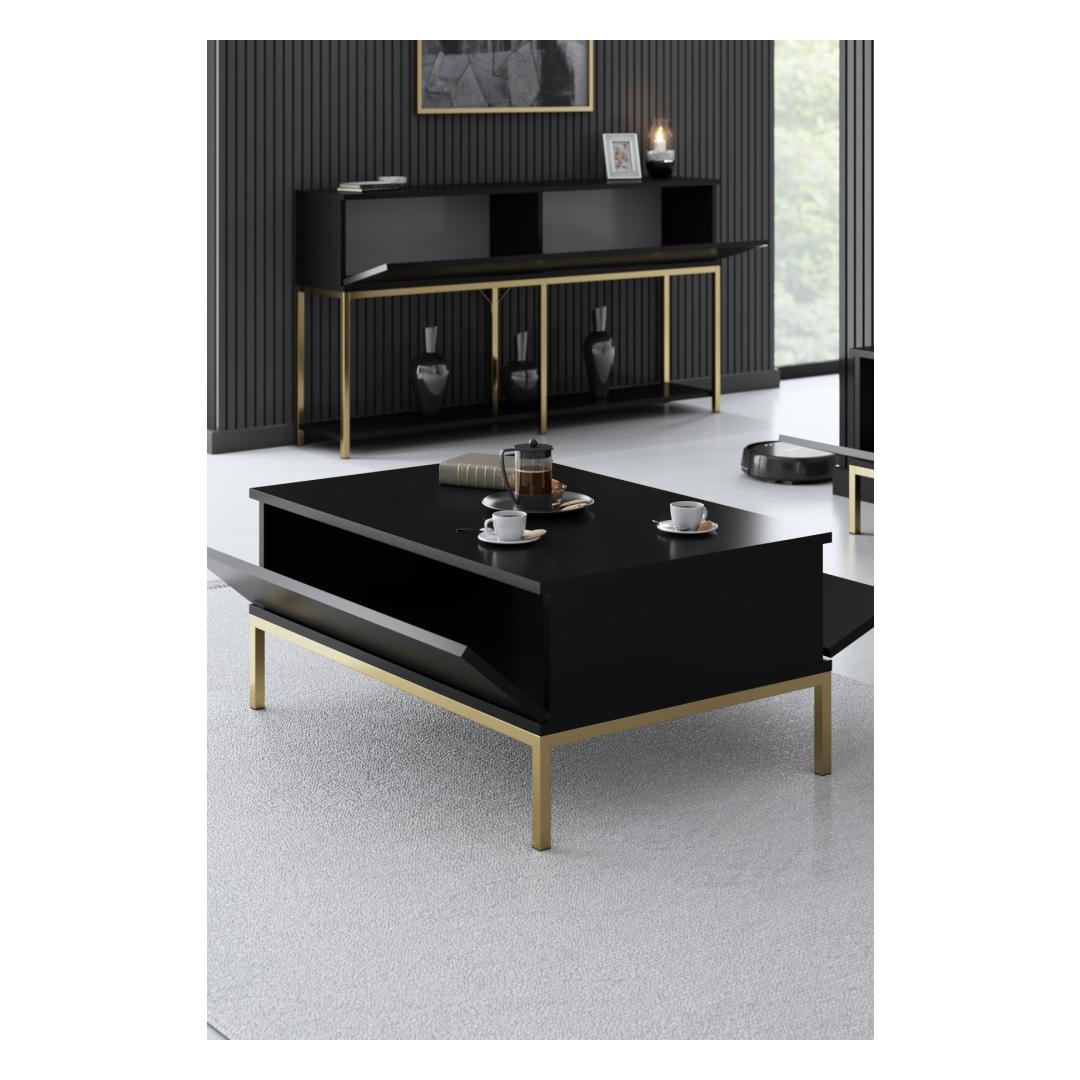 Selle kohvilauda elegantset ja moodsat disaini rõhutavad metalljalad, mis lisavad teie elutuppa elegantse nüansi. Musta ja kuldse värvi kombinatsioon loob silmatorkava kontrasti, mis õhkab elegantsi ja stiili, muutes selle tõeliseks statement-tükiks, mis avaldab külalistele muljet.