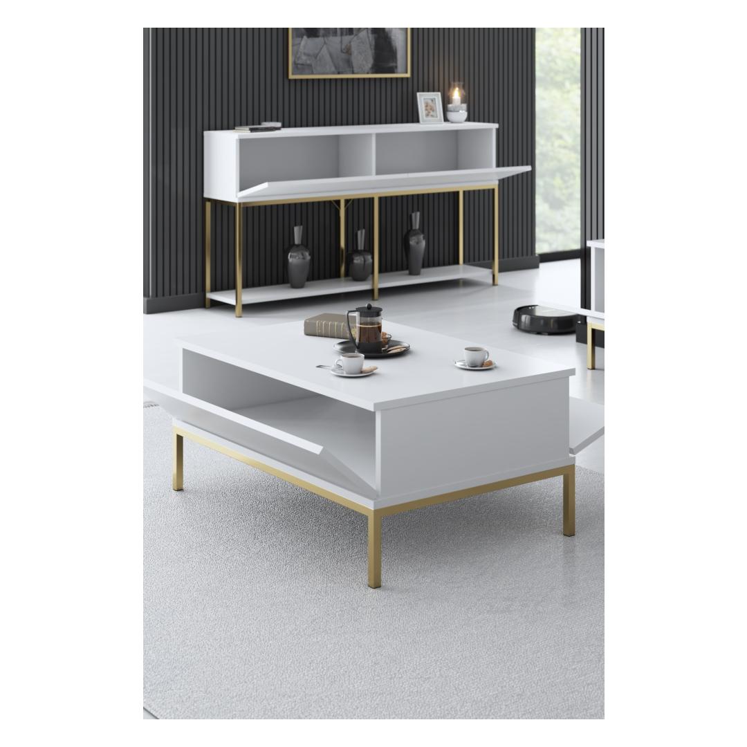 Meie kohvilaud lisab oma elegantse disaini ning valge ja kuldse värvi uimastava kombinatsiooniga igasse ruumi luksust. Melamiiniga kaetud puitlaastplaat tagab sileda ja läikiva viimistluse, mis annab sellele esmaklassilise välimuse, mis kindlasti muljet avaldab.