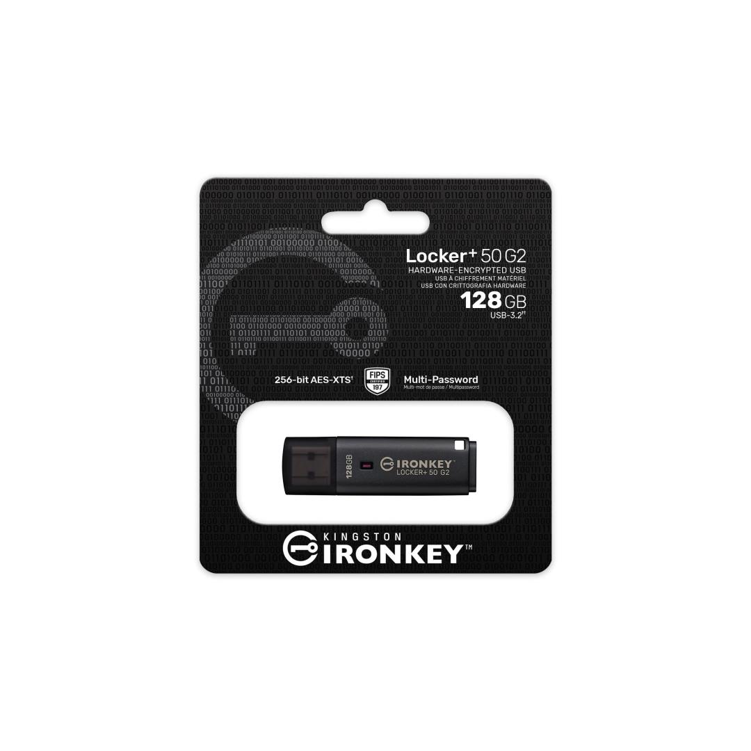 Kingston Technology IronKey 128GB Locker Plus 50 G2, FIPS 197, AES-256. Capacity: 128 GB, Device interface: USB Type-A, USB version: 3.2 Gen 1 (3.1 Gen 1), Read speed: 145 MB/s, Write speed: 115 MB/s. Form factor: Cap. Weight: 22.94 g. Product colour: Black