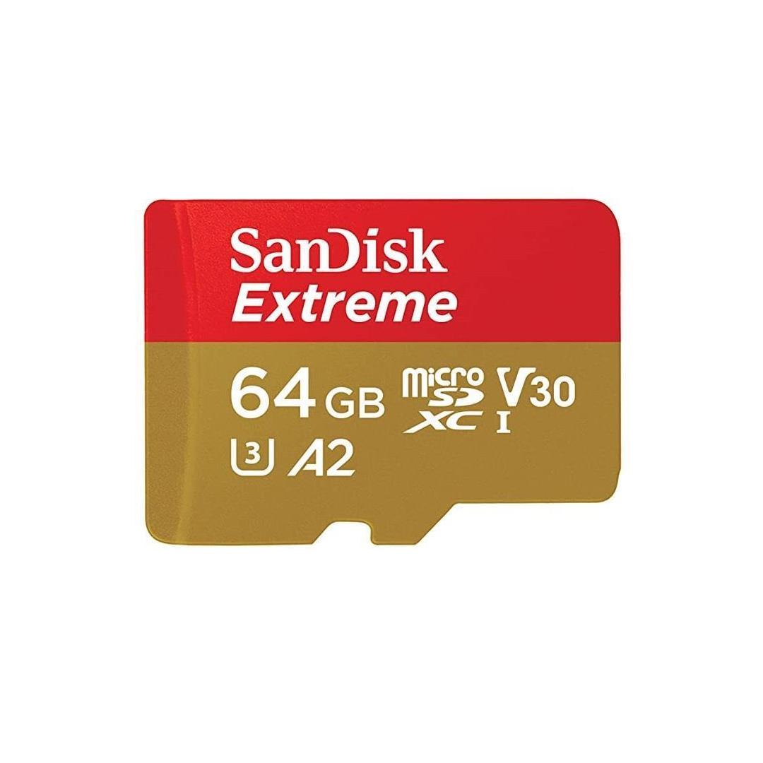 SanDisk Extreme microSDXC 64GB for Action Cams and Drones + SD Adapter + 1 year RescuePRO Deluxe up to 170MB/s & 80MB/s Read/Write speeds A2 C10 V30 UHS-I U3