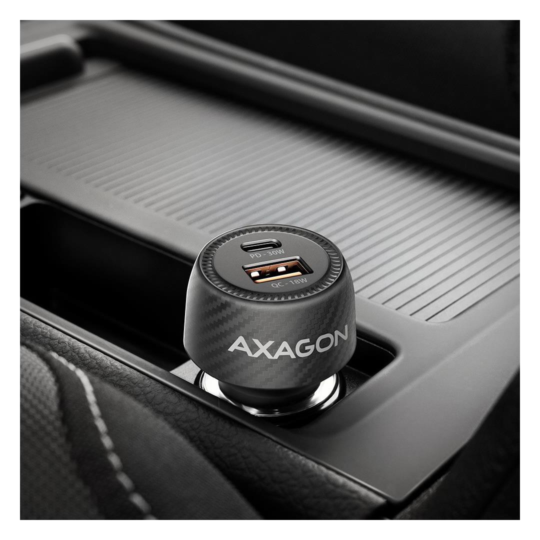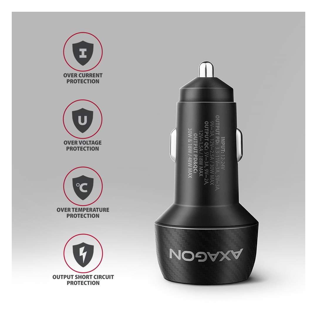 Axagon PWC-PQ48 PD3.0 & QC4+ 2xOUTPUTS car charger 48W. Charger type: Auto, Power source type: Cigar lighter, Charger compatibility: Universal. Input voltage: 12 - 24 V. USB 2.0 ports quantity: 1, USB Type-C ports quantity: 1, Fast charging, Power protection features: Over current, Over voltage, Overheating, Short circuit. Product colour: Black