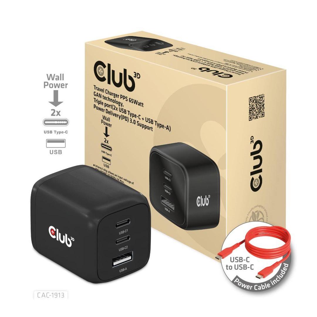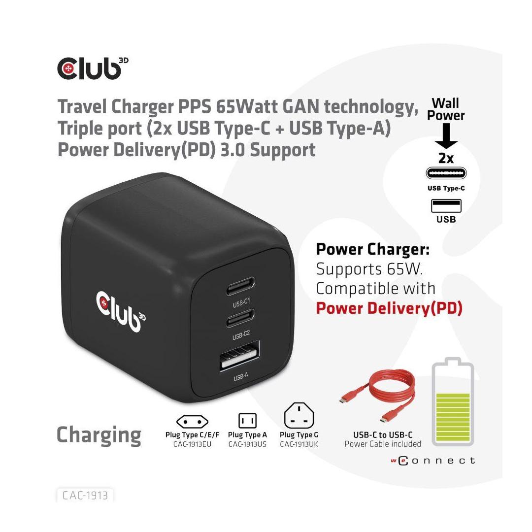 The Club3D CAC-1913 Travel Charger PPS 65Watt GAN technology, Triple port(2x USB Type-C + USB Type-A) Power Delivery(PD) 3.0 Support. GAN technology chipset makes this charger 50% smaller than a 65Watt traditional charger, small enough to carry anywhere.The Programmable Power Supply(PPS) 65Watt wall charger match a variety of PD devices from smart phones to laptops, one for all making charging simple. This wide compatibility charger will be your convenient companion during your business trip or vacation. The Power Charger is light weight without compromising on Quality and safety. By adopting Power Delivery(PD) charging technology, this versatile Power Charger provides you with charging functions through Dual USB Type-C plus a USB Type-A interface, you can charge any connected Mobilephone / Tablet / NoteBook. Furthermore all it needs is a free USB Type-C port on your Dock/NoteBook/Tablet/ Mobile phone to be charged via the bundled USB Type-C cable.