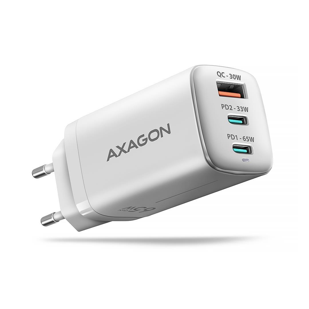GaN wallcharger 3x port (USB-A + 2x USB-C), PD3.0 / PPS / QC4+ / SFC2.0 / AFC / SCP / FCP / Apple. 65W total power.