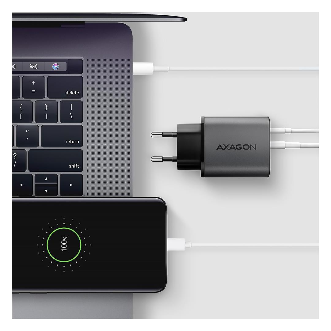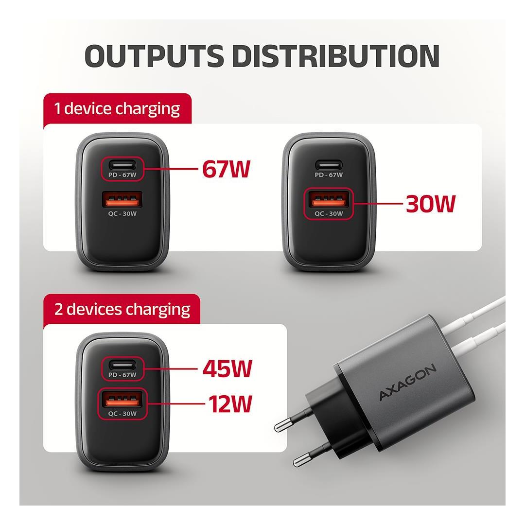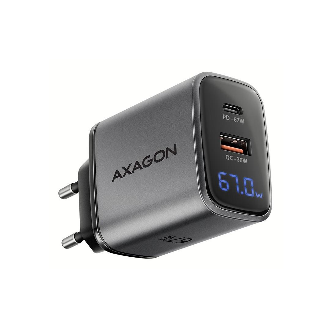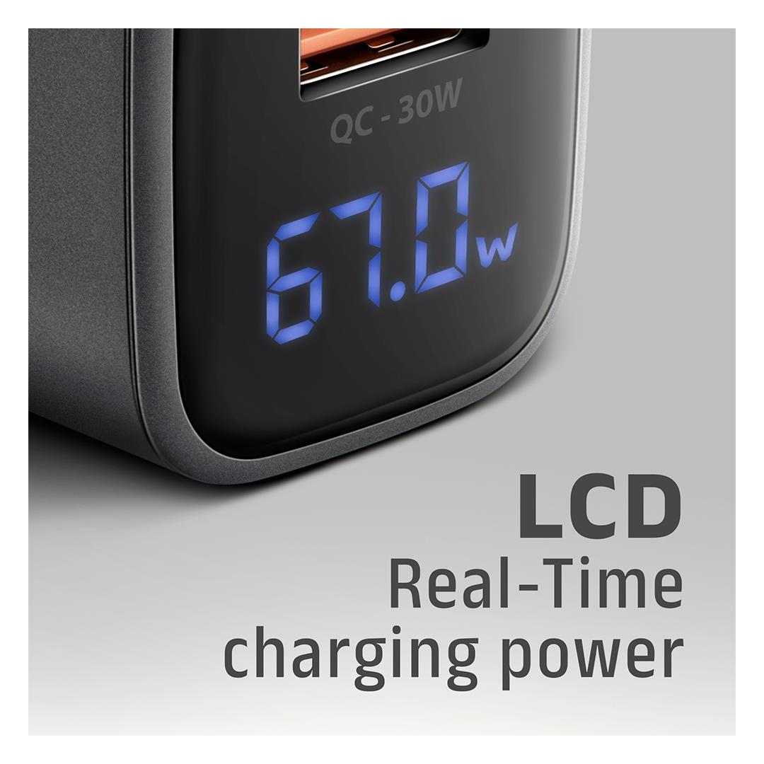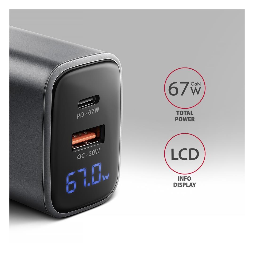 Travel wall charger AXAGON ACU-PQ67D GaN enables fast charging of up to two mobile devices simultaneously. Thanks to the total 67W output power, the charger can recharge laptops, tablets, phones and other mobile devices at the highest possible speed. The adapter offers not only a standard USB-A connector, but also a reversible USB-C connector. The clear LCD display shows the current charging power.