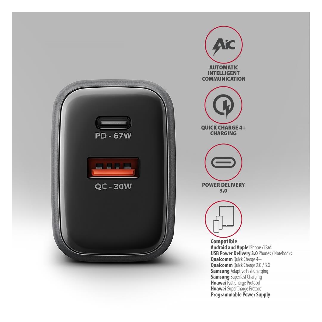 Quick Charge 4+ technology enables up to 4x faster phone charging compared to a standard USB charger. Power Delivery 3.0 technology not only supports charging of modern phones, but also enables 67W charging of modern laptops.