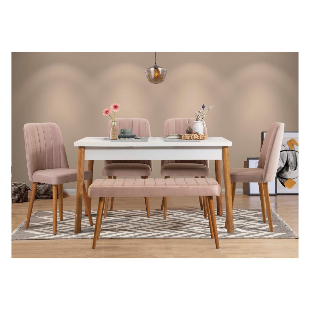 Komplekti kuulub ka metallraamiga ja 100% sametist vahtkangaga pink, mis lisab teie söögikohale mitmekülgsust ja šikkust. See on 100 cm lai, 48 cm kõrge ja 39 cm sügav, pakkudes täiendavat istumisvõimalust või seda saab kasutada stiilse aktsendina.
