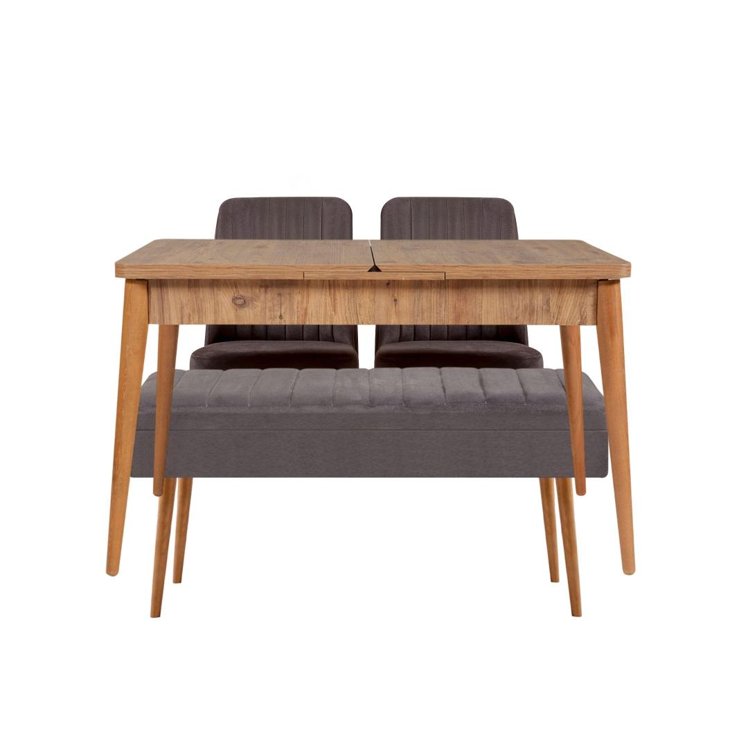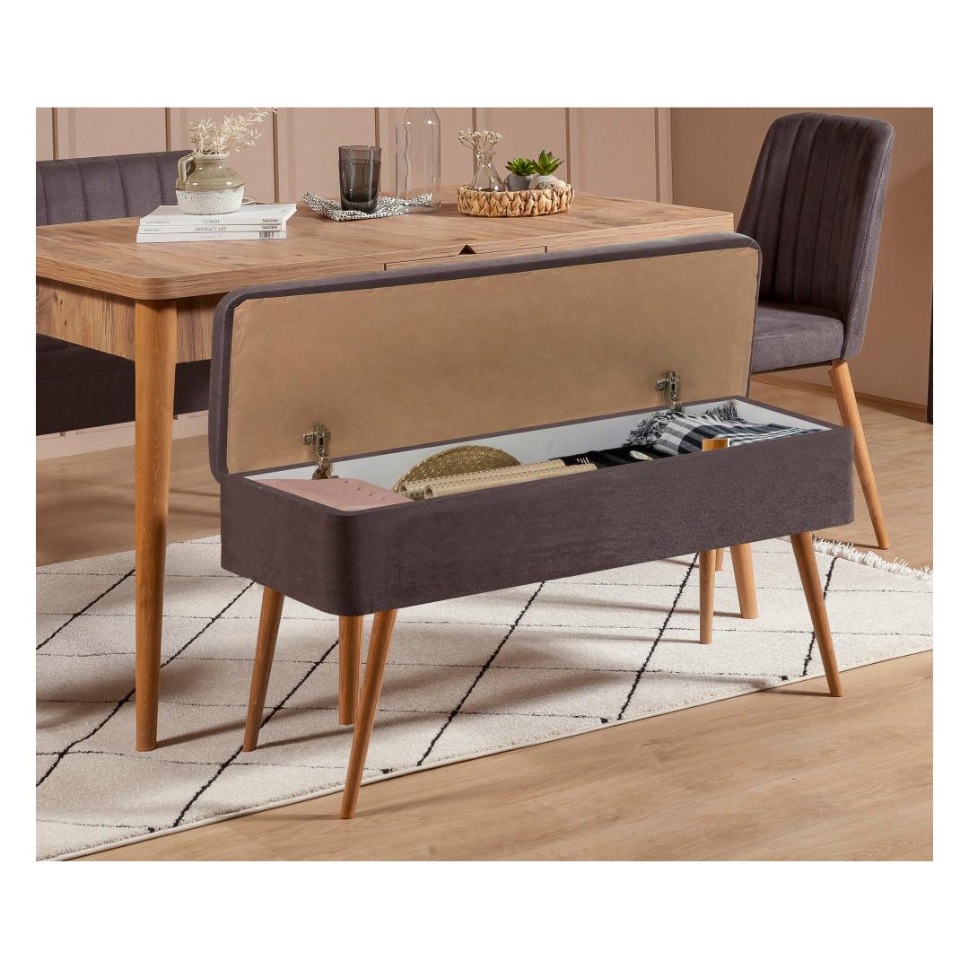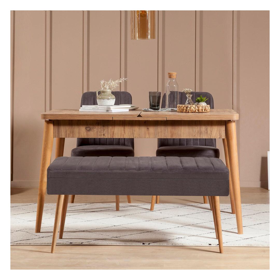 Tänu pikendatavale disainile kohandub söögilaud hõlpsasti teie vajadustele, mahutades nii intiimseid koosviibimisi kui ka suuremaid pidusid. Avatud 163 cm suurune laud pakub piisavalt ruumi, et kõik saaksid koos maitsvat sööki nautida. Luksusliku sametkangaga polsterdatud mugavad toolid pakuvad mõnusat istumisvõimalust, samas kui pink lisab ainulaadse puudutuse ja lisatoe.